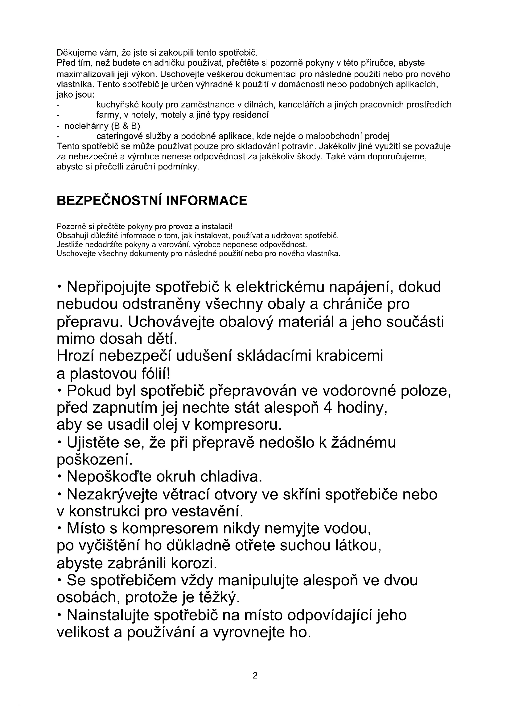 Pozorně si přečtěte pokyny pro provoz a instalaci! Obsahují důležité informace o tom, jak instalovat, používat a udržovat spotřebič. Jestliže nedodržíte pokyny a varování, výrobce neponese odpovědnost. Uschovejte všechny dokumenty pro následné použití nebo pro nového vlastníka. Nepřipojujte spotřebič k elektrickému napájení, dokud nebudou odstraněny všechny obaly a chrániče pro přepravu. Uchovávejte obalový materiál a jeho součásti mimo dosah dětí. Hrozí nebezpečí udušení skládacími krabicemi a plastovou fólií! Pokud byl spotřebič přepravován ve vodorovné poloze, před zapnutím jej nechte stát alespoň 4 hodiny, aby se usadil olej v kompresoru. Ujistěte se, že při přepravě nedošlo k žádnému poškození. Nepoškoďte okruh chladiva. Nezakrývejte větrací otvory ve skříni spotřebiče nebo v konstrukci pro vestavění. Místo s kompresorem nikdy nemyjte vodou, po vyčištění ho důkladně otřete suchou látkou, abyste zabránili korozi. Se spotřebičem vždy manipulujte alespoň ve dvou osobách, protože je těžký. Nainstalujte spotřebič na místo odpovídající jeho velikost a používání a vyrovnejte ho.3 Pouze pro Spojené království: Napájecí kabel spotřebiče je vybaven trojpólovou zástrčkou (s uzemněním), která se zapojuje do standardní trojpólové zásuvky (s uzemněním). Nikdy neodřezávejte ani nedemontujte třetí kolík (uzemnění). Zástrčka by měla být přístupná i po instalaci spotřebiče. Při přenášení/přesouvání spotřebiče dbejte na to, aby se kabel napájení nezachytil pod spotřebičem. Mohlo vy dojít k přeříznutí nebo poškození kabelu napájení. Pokud se poškodí napájecí kabel, výměnu musí provést výrobce, jeho servisní zástupce nebo osoby s podobnou kvalifikací, aby se vyloučilo riziko. Neinstalujte spotřebič ve vlhkém, mastném nebo prašném prostředí, zabraňte působení přímých slunečních paprsků nebo vody. Neinstalujte spotřebič poblíž zdrojů tepla nebo hořlavých materiálů. PRO spotřebiče s mrazákem: pokud dojde k výpadku napájení, neotevírejte víko. Jestliže trvá výpadek méně hodin, než je uvedeno na typovém štítku (Doba vzrůstu teploty), nemělo by to ovlivnit zmrazené potraviny. Jestliže trvá výpadek déle, je nutné potraviny zkontrolovat a okamžitě zkonzumovat, nebo uvařit a potom opět zmrazit. Pokud zjistíte, že víko spotřebiče se ihned po zavření obtížně otvírá, nemějte obavy. Je to způsobeno rozdílem tlaku, který se vyrovná a za několik minut budete moci víko normálně otevřít. Ve spotřebiči neskladujte léky, bakterie ani chemické látky. Tento spotřebič je určen k použití v domácnosti, nedoporučuje se v něm skladovat materiály, které vyžadují přesně stanovené teploty. Ujistěte se, že parametry elektrického napájení se shodují s údaji na typovém štítku. V opačném případě kontaktujte elektrikáře.4 Netahejte a neohýbejte kabel napájení, nedotýkejte se zásuvky mokrýma rukama. Ve spotřebiči neskladujte látky obsahující hořlavý hnací plyn (např. aerosolové nádoby) nebo výbušné látky. Hrozí nebezpečí výbuchu! Nepokládejte na horní stranu chladničky nestabilní předměty (těžké předměty, nádoby naplněné vodou), aby se předešlo zranění způsobenému pádem nebo elektrickým proudem v důsledku styku s vodou. Uvnitř prostoru pro skladování potravin nepoužívejte elektrické spotřebiče, pokud se nejedná o spotřebiče doporučené výrobcem. Nedotýkejte se vnitřních chladicích prvků, zejména ne mokrýma rukama, aby se zamezilo prasknutí nebo zranění. Nebezpečí hrozí dětem, osobám s omezenými fyzickými, smyslovými nebo duševními schopnostmi, stejně jako osobám s nedostatečnými znalostmi o bezpečném používání spotřebiče. Zkontrolujte, zda děti a ohrožené osoby chápou nebezpečí. Osoba zodpovědná za bezpečnost musí dohlížet na děti a ohrožené osoby používající spotřebič, nebo je musí poučit. Spotřebič mohou používat pouze děti starší osmi let. Děti si nesmí hrát se spotřebičem. Děti ve věku od tří do osmi let smějí vkládat potraviny a vyjímat je z tohoto spotřebiče. PRO spotřebiče s mrazákem: neukládejte do mrazáku tekutiny v láhvích nebo plechovkách (zejména nápoje sycené oxidem uhličitým). Láhve a plechovky mohou prasknout! PRO spotřebiče s mrazákem: nikdy nevkládejte do úst zmrazené potraviny přímo z mrazáku. Hrozí nebezpečí vzniku omrzlin!5 Chraňte plastové součásti a těsnění dveří před olejem a tukem. Jinak by se na plastových součástech a těsnění dveří mohly vytvořit póry. Před jakoukoli manipulací se spotřebičem odpojte napájecí kabel od zásuvky. Nepoužívejte mechanické nástroje ani jinak neurychlujte proces rozmrazování. Používejte pouze prostředky doporučené výrobcem. K odstraňování námrazy nepoužívejte špičaté nebo ostré předměty. K odmrazování nikdy nepoužívejte vysoušeče vlasů, elektrické ohřívače a jiné podobné elektrické spotřebiče. Doporučuje se udržovat zástrčku v čistém stavu. Nánosy prachu na zástrčce mohou způsobit požár. Nepokoušejte se opravovat, rozebírat nebo upravovat spotřebič vlastními silami. Je-li nutná oprava, vždy se obraťte na náš zákaznický servis. Během čištění nebo údržby spotřebiče dohlížejte na děti. Nečistěte chladné skleněné police horkou vodou. Náhlá změna teploty by mohla způsobit, že sklo praskne. VAROVÁNÍ: V trubicích chladicího okruhu proudí malé množství chladiva (R600a) a izolačního plynu (cyklopentanu); tyto látky jsou šetrné k životnímu prostředí, ale hořlavé. Nepoškozují ozónovou vrstvu a nezvyšují účinky skleníkového efektu. Pokud chladivo unikne, mohlo by vám poškodit zrak, nebo by se mohlo vzn