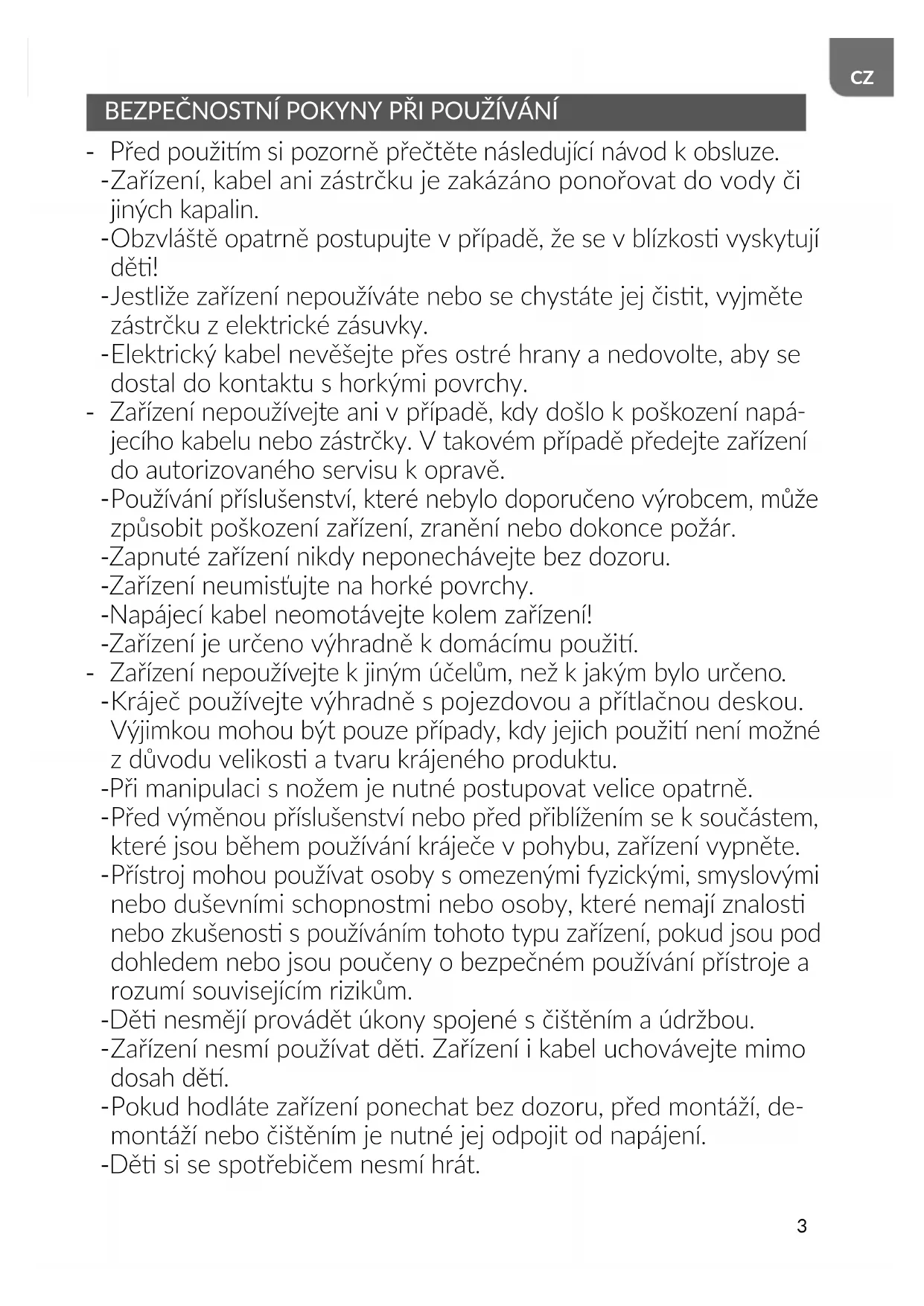 VAROVÁNÍ! Nedovolte, aby si dě hrály s fólií. Nebezpečí udušení! - POZOR ! Nůž je velice ostrý, vyvarujte se fyzického kontaktu s ním během čištění zařízení - mohli byste se vážně zranit. - Nakrájejte příliš zmrzlé potraviny, např. zmrzlé maso nebo kos.