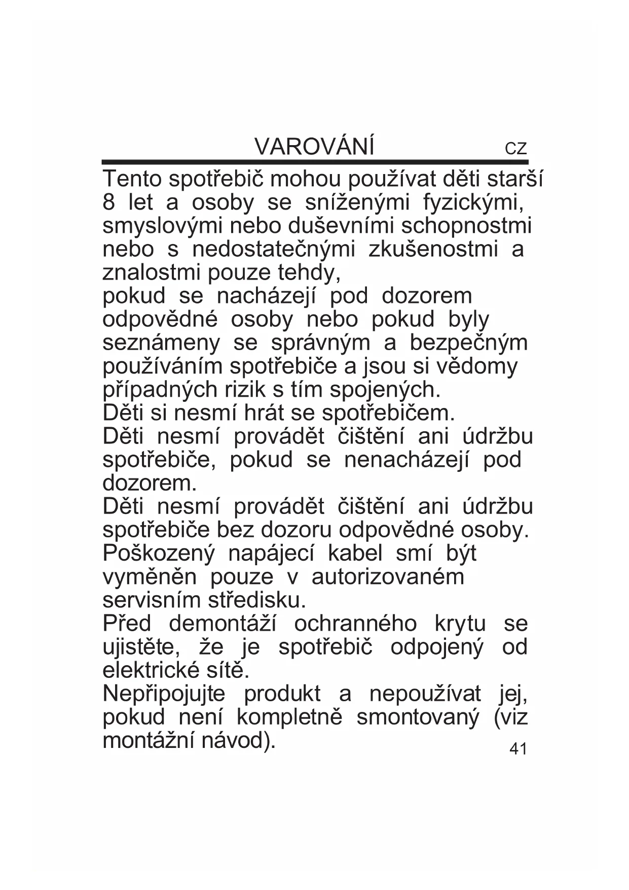 “Aplicación de la Directiva 2012/19/EU sobre Residuos de Aparatos Eléctricos y Electrónicos (RAEE)”, concerniente al uso reducido de sustancias peligrosas en equipos eléctricos y electrónicos, así como a la eliminación de residuos”. El símbolo del contenedor marcado con una X señalado en el equipo o en la confección indica que el producto al nal de su vida útil debe ser recogido separadamente de los otros desechos. El usuario por lo tanto tendrá que entregar el equipo que llegó al nal de su vida a los centros comunales de recogida diferenciada de desechos eléctricos y electrónicos idóneos. Para más detalles, por favor contactar a la autoridad local correspondiente. La adecuada recogida diferenciada para el envío sucesivo del equipo al reciclaje, al tratamiento y a la eliminación ambientalmente compatible contribuye a evitar posibles efectos negativos en el ambiente y en la salud y favorece el reutilizo y/o reciclado de los materiales que componen el equipo. La eliminación abusiva del producto por parte del usuario dará lugar a la aplicación de multas administrativas de conformidad con las leyes en vigor. ELIMINACIÓN EMBALAJE Con el n de respetar el medio ambiente, el material de embalaje debe ser eliminado correctamente de acuerdo con la recogida selectiva. Compruebe la normativa local.40 GARANTÍA Condiciones La garantía tiene validez de 24 meses desde la fecha de la compra. La presente garantía es válida solo si es correctamente llenada y acompañada de la factura scal que certica la fecha de la compra. El aparato debe ser entregado exclusivamente en un Centro de Asistencia nuestro autorizado. Por garantía se entiende la sustitución o la reparación de los componentes del aparato que resultan defectuosos en el origen por defectos de fabricación. Está de todos modos garantizada la asistencia (con pago) incluso en productos fuera de garantía. El consumidor es titular de los derechos aplicables por la legislación nacional que disciplina la venta de los bienes de consumo; esta garantía deja no perjudica estos derechos. La Casa fabricante declina toda responsabilidad por eventuales daños a personas, animales o cosas, consecuencia de uso inadecuado del aparato y la inobservancia de las prescripciones indicadas en el respectivo manual de instrucciones. Limitaciones Todo derecho de garantía y toda responsabilidad nuestra decaen si el aparato ha sido: -Manipulado por parte de personal no autorizado. -Empleado, conservado o transportado de manera inadecuada. Están de todos modos excluidas de la garantías las pérdidas de prestaciones estéticas o tales de no comprometer la sustancia de las funciones. Si, no obstante el cuidado en la selección de los materiales y el empeño en la realización del producto que ha apenas comprado se detectaran defectos, o en caso de que necesitara información, le recomendamos llamar al revendedor de zona.41 Tento spotřebič mohou používat děti starší 8 let a osoby se sníženými fyzickými, smyslovými nebo duševními schopnostmi nebo s nedostatečnými zkušenostmi a znalostmi pouze tehdy, pokud se nacházejí pod dozorem odpovědné osoby nebo pokud byly seznámeny se správným a bezpečným používáním spotřebiče a jsou si vědomy případných rizik s tím spojených. Děti si nesmí hrát se spotřebičem. Děti nesmí provádět čištění ani údržbu spotřebiče, pokud se nenacházejí pod dozorem. Děti nesmí provádět čištění ani údržbu spotřebiče bez dozoru odpovědné osoby. Poškozený napájecí kabel smí být vyměněn pouze v autorizovaném servisním středisku. Před demontáží ochranného krytu se ujistěte, že je spotřebič odpojený od elektrické sítě. Nepřipojujte produkt a nepoužívat jej, pokud není kompletně smontovaný (viz montážní návod). VAROVÁNÍ CZ42 UPOZORNĚNÍ: Pečlivě si přečtěte tento návod k obsluze, který obsahuje důležité pokyny týkající se bezpečné instalace, použití a údržby spotřebiče. Uschovejte tento návod pro případné použití v budoucnu. Děti si nesmí hrát se spotřebičem. Tento spotřebič smí být používán pouze k účelům, ke kterým byl navržen; jakékoliv použití, které není v souladu s pokyny obsaženými v tomto návodu k obsluze, se považuje za nevhodné a nebezpečné. Výrobce nenese odpovědnost za možné škody způsobené nevhodným a/nebo nepřiměřeným použitím. Tento spotřebič NENÍ vhodný k použití v prostředí, kde hrozí nebezpečí výbuchu (tam, kde se vyskytují hořlavé látky, jako je plyn, pára, mlha nebo prach, za atmosférických podmínek, kdy se spaliny po zapálení šíří ve vzduchu). Obalové materiály (igelitové sáčky, polystyren atd.) musíte uchovávat mimo dosah dětí nebo zdravotně postižených osob, protože představují potenciální zdroj nebezpečí. Instalace/montáž spotřebiče musí být provedena podle pokynů výrobce. Špatný postup může způsobit poranění osob či zvířat nebo poškození předmětů, za které výrobce nenese žádnou odpovědnost. Umístěte spotřebič na horizontální a stabilní povrch. Před prvním použitím spotřebiče zkontrolujte, zda nedošlo k poškození napájecího kabelu nebo samotného spotřebiče během přepravy. Pokud si nejste jistí, obraťte se na kvalikovanou osobu. Před prvním připojením spotřebiče k elektrické síti se ujistěte, že jmenovitý výkon (napětí a frekvence) spotřebiče odpovídá Vaší elektrické síti a že zásuvka je vhodná pro zástrčku spotřebiče. Ujistěte se, že napájecí systém je vybaven vhodnou ochranou podle platných zákonů. NEPŘIPOJUJTE spotřebič k vícenásobné zásuvce. Pokud je to možné, vyvarujte se použití adaptérů a/nebo prodlužovacích kabelů; pokud je jejich použití naprosto nezbytné, používejte pouze materiály, které odpovídají současným bezpečnostním předpisům a vyhovují elektrickým 