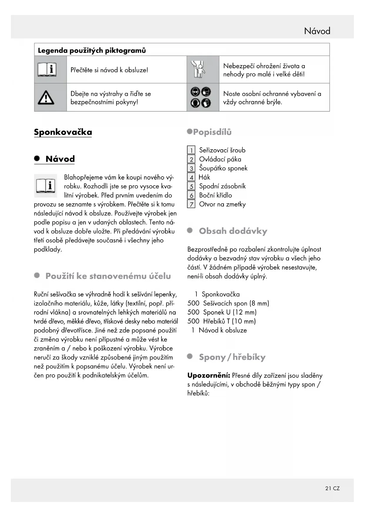 před dětmi. Výrobek není hračkou. Tento přístroj mohou používat děti starší než 8 let, osoby se sníženými fyzickými, senzorickými nebo duševními schopnosti nebo s nedostatečnými zkušenostmi a znalostmi o používání přístroje jen tehdy, jestliže byly poučeny o jeho bezpečném používání a porozuměly možným ohrožením. Děti si nesmí s přístrojem hrát. Děti nesmí provádět čištění a údržbu bez dohledu. Chraňte výrobek před dětmi. Děti často podcení nebezpečí. Zařízení skladujte v suché, uzavřené místnosti, nedosažitelné pro děti. Postarejte se o to, aby v žádném případě lidé nebo zvířata nebyly trefeny sponami nebo hřebíky! Jinak hrozí nebezpečí poranění. Noste osobní ochranné vybavení a vždy ochranné brýle. To platí i pro osobu, která během práce se zaříze- ním vykonává opěrné a uchycovaní práce. POZOR! Vžádném případě neopírejte ruce vedle ruční sešívačky nebo před ní nebo před opracovanou plochou, neboť existuje při sklouz- nutí nebezpečí poranění. Před uvedením do provozu se ujistěte, že se zařízení nachází v bezvadném stavu! Poškozené díly zařízení mohou způsobit poranění. Zkontrolujte, že jsou všechny díly odborně namontovány. Při neodborné montáži existuje nebezpečí poranění. Buďte vždy pozorní a dbejte neustále na to, co činíte. Dejte se do práce s rozumem. Už okamžik nepozornosti při montáži může vést k poraněním. Pečujte o to, aby se při přepravě nebo při skla- dování ruční sešívačky vzařízení nenacházely sešívací spony nebo hřebíky. Obsluha Naplnění spon / hřebíků POZOR! Použijte jen v tomto návodu popsané spony a hřebíky (viz „Spony / hřebíky“). Jinak hrozí poškození zařízení. Upozornění: Ruční sešívačkou můžete zpracová- vat tři různé typy spon / hřebíků. K tomu patří sešívací spony, spony U a hřebíky T. Postupujte následujícím způsoben: