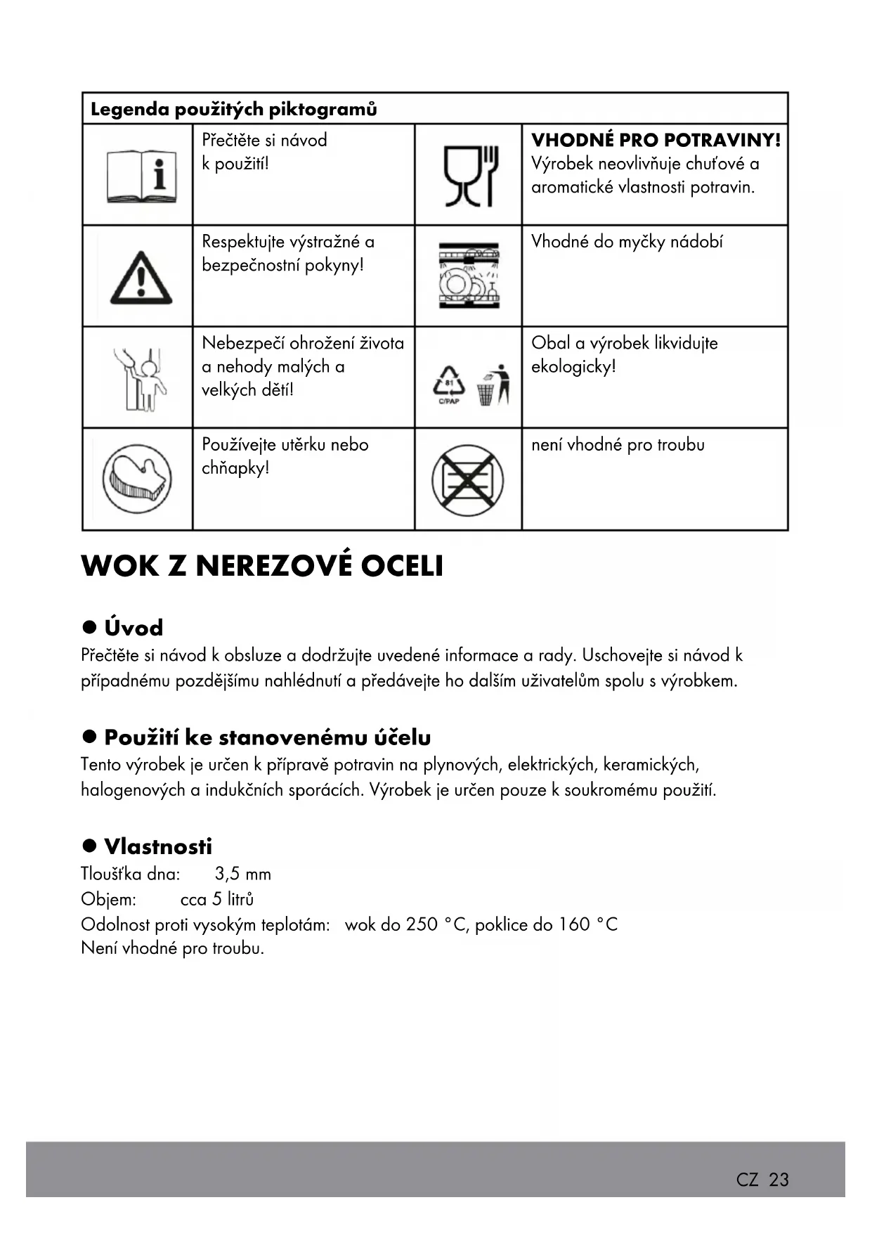 l Úvod Přečtěte si návod k obsluze a dodržujte uvedené informace a rady. Uschovejte si návod k případnému pozdějšímu nahlédnutí a předávejte ho dalším uživatelům spolu s výrobkem. l Použití ke stanovenému účelu Tento výrobek je určen k přípravě potravin na plynových, elektrických, keramických, halogenových a indukčních sporácích. Výrobek je určen pouze k soukromému použití. l Vlastnosti Tloušťka dna: 3,5 mm Objem: cca 5 litrů Odolnost proti vysokým teplotám: wok do 250 °C, poklice do 160 °C Není vhodné pro troubu. CZ 23Výrobek je vhodný pro: plynové plotýnky indukční plotýnky elektrické plotýnky halogenové plotýnky sklokeramické desky