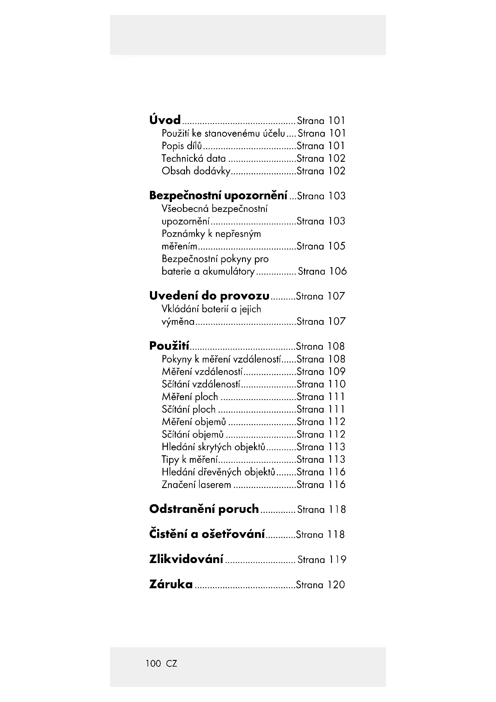 zoals bijv. schakelaars, accu’s of dergelijke onderdelen, die gemaakt zijn van glas.100 CZ Úvod ............................................. Strana 101 Použití ke stanovenému účelu .... Strana 101 Popis dílů .....................................Strana 101 Technická data ...........................Strana 102 Obsah dodávky ..........................Strana 102 Bezpečnostní upozornění ...Strana 103 Všeobecná bezpečnostní upozornění ..................................Strana 103 Poznámky k nepřesným měřením .......................................Strana 105 Bezpečnostní pokyny pro baterie a akumulátory ................ Strana 106 Uvedení do provozu ..........Strana 107 Vkládání baterií a jejich výměna ........................................Strana 107 Použití ..........................................Strana 108 Pokyny k měření vzdáleností ......Strana 108 Měření vzdáleností .....................Strana 109 Sčítání vzdáleností ......................Strana 110 Měření ploch ..............................Strana 111 Sčítání ploch ...............................Strana 111 Měření objemů ...........................Strana 112 Sčítání objemů ............................Strana 112 Hledání skrytých objektů ............Strana 113 Tipy k měření ...............................Strana 113 Hledání dřevěných objektů ........Strana 116 Značení laserem .........................Strana 116 Odstranění poruch .............. Strana 118 Čistění a ošetřování ............Strana 118 Zlikvidování ............................ Strana 119 Záruka ........................................Strana 120101 CZ Multifunkční detektor Úvod Blahopřejeme Vám ke koupi nového výrob ku. Rozhodli jste se pro kvalitní produkt. Ná- vod kobsluze je součástí tohoto výrobku. Obsahuje důležité pokyny pro bezpečn ost, použití a likvidaci. Před použitím výrobku se seznamte se všemi pokyny k obsluze a bezpečnostními pokyny. Používejte výrobe