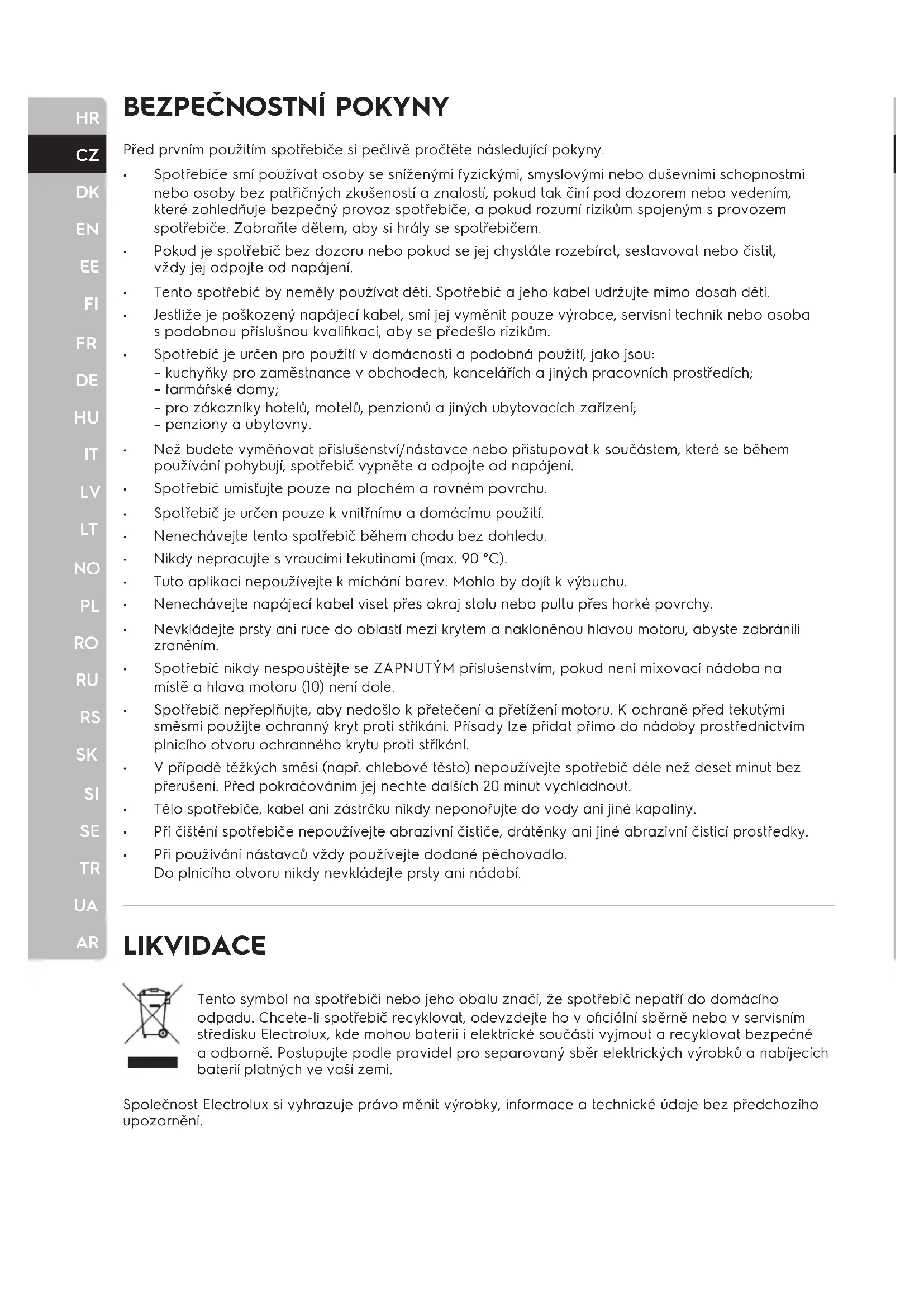 LIKVIDACE Tento symbol na spotřebiči nebo jeho obalu značí, že spotřebič nepatří do domácího odpadu. Chcete-li spotřebič recyklovat, odevzdejte ho v oficiální sběrně nebo v servisním středisku Electrolux, kde mohou baterii i elektrické součásti vyjmout a recyklovat bezpečně a odborně. Postupujte podle pravidel pro separovaný sběr elektrických výrobků a nabíjecích baterií platných ve vaší zemi. Společnost Electrolux si vyhrazuje právo měnit výrobky, informace a technické údaje bez předchozího upozornění. Před prvním použitím spotřebiče si pečlivě pročtěte následující pokyny.