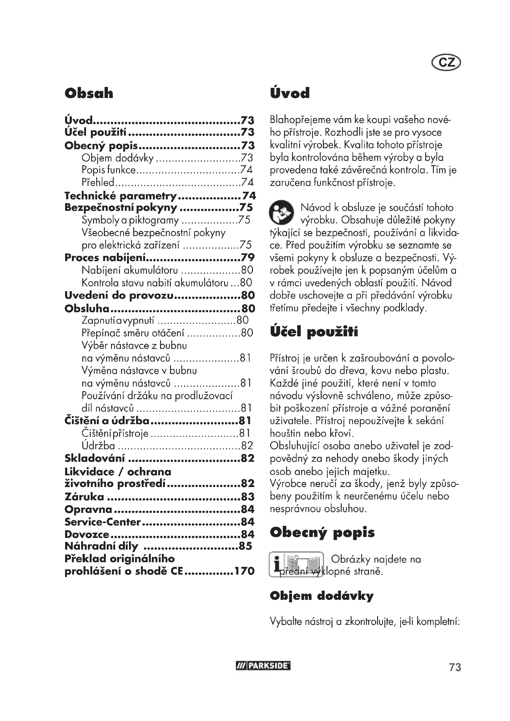 - Úvod Blahopřejeme vám ke koupi vašeho nové- ho přístroje. Rozhodli jste se pro vysoce kvalitní výrobek. Kvalita tohoto přístroje byla kontrolována během výroby a byla provedena také závěrečná kontrola. Tím je zaručena funkčnost přístroje. Návod k obsluze je součástí tohoto výrobku. Obsahuje důležité pokyny týkající se bezpečnosti, používání a likvida- ce. Před použitím výrobku se seznamte se všemi pokyny k obsluze a bezpečnosti. Vý- robek používejte jen k popsaným účelům a v rámci uvedených oblastí použití. Návod dobře uschovejte a při předávání výrobku třetímu předejte i všechny podklady. Účel použití Přístroj je určen k zašroubování a povolo- vání šroubů do dřeva, kovu nebo plastu. Každé jiné použití, které není v tomto návodu výslovně schváleno, může způso- bit poškození přístroje a vážné poranění uživatele. Přístroj nepoužívejte k sekání houštin nebo křoví. Obsluhující osoba anebo uživatel je zod- povědný za nehody anebo škody jiných osob anebo jejich majetku. Výrobce neručí za škody, jenž byly způso- beny použitím k neurčenému účelu nebo nesprávnou obsluhou. Obecný popis Obrázky najdete na přední výklopné straně. Objem dodávky Vybalte nástroj a zkontrolujte, je-li kompletní: Překlad originálního prohlášení o shodě CE p. 1707