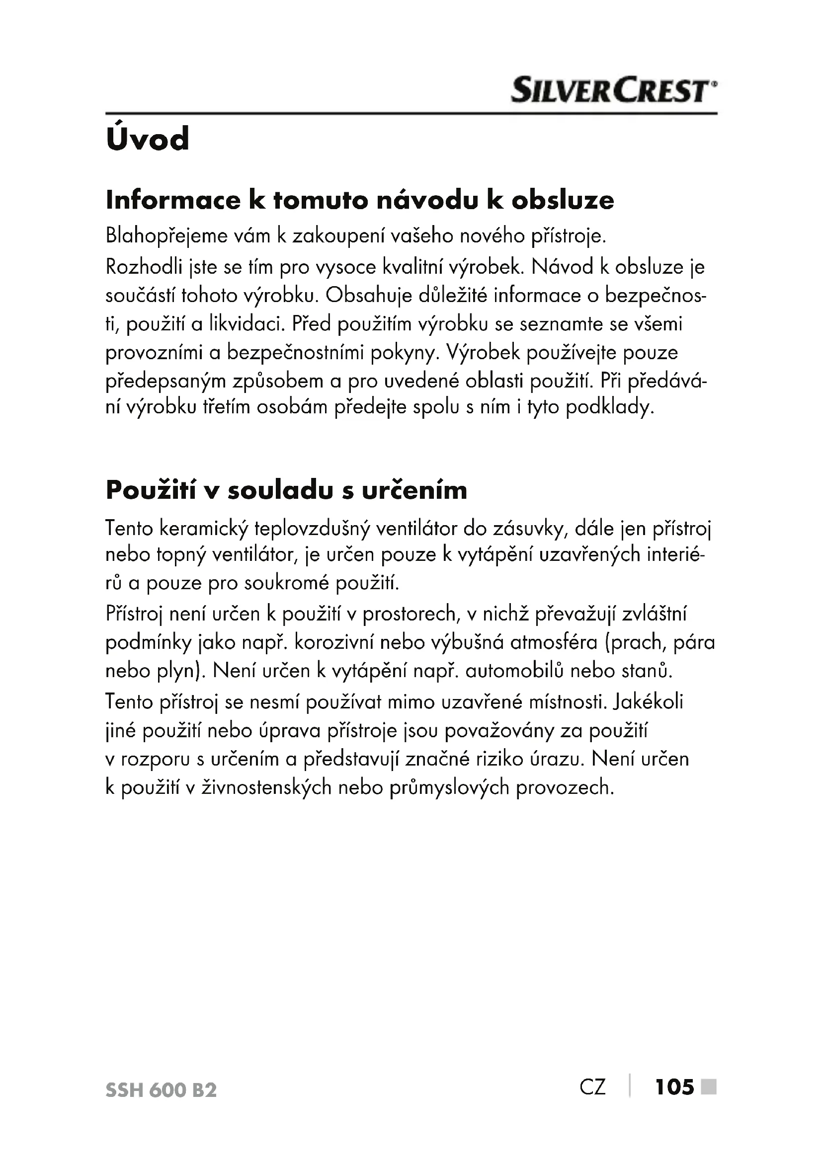 105 ■ Úvod Informace ktomuto návodu kobsluze Blahopřejeme vám kzakoupení vašeho nového přístroje. Rozhodli jste se tím pro vysoce kvalitní výrobek. Návod kobsluze je součástí tohoto výrobku. Obsahuje důležité informace obezpečnos- ti, použití a likvidaci. Před použitím výrobku se seznamte se všemi provozními a bezpečnostními pokyny. Výrobek používejte pouze předepsaným způsobem a pro uvedené oblasti použití. Při předává- ní výrobku třetím osobám předejte spolu sním ityto podklady. Použití vsouladu surčením Tento keramický teplovzdušný ventilátor do zásuvky, dále jen přístroj nebo topný ventilátor, je určen pouze k vytápění uzavřených interié- rů a pouze pro soukromé použití. Přístroj není určen kpoužití vprostorech, vnichž převažují zvláštní podmínky jako např. korozivní nebo výbušná atmosféra (prach, pára nebo plyn). Není určen k vytápění např. automobilů nebo stanů. Tento přístroj se nesmí používat mimo uzavřené místnosti. Jakékoli jiné použití nebo úprava přístroje jsou považovány za použití vrozporu surčením a představují značné riziko úrazu. Není určen kpoužití vživnostenských nebo průmyslových provozech.SSH 600 B2 ■ 106