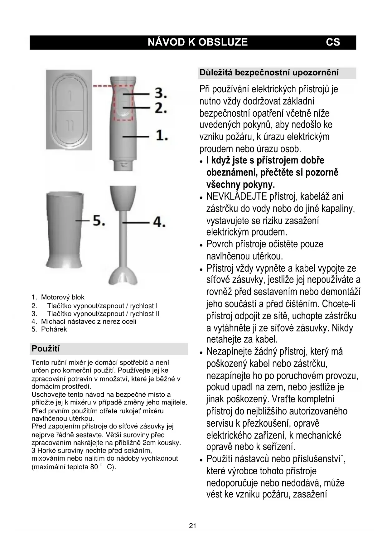 Použití Tento ruční mixér je domácí spotřebič a není určen pro komerční použití. Používejte jej ke zpracování potravin v množství, které je běžné v domácím prostředí. Uschovejte tento návod na bezpečné místo a přiložte jej k mixéru v případě změny jeho majitele. Před prvním použitím otřete rukojeť mixéru navlhčenou utěrkou. Před zapojením přístroje do síťové zásuvky jej nejprve řádně sestavte. Větší suroviny před zpracováním nakrájejte na přibližně 2cm kousky. 3 Horké suroviny nechte před sekáním, mixováním nebo nalitím do nádoby vychladnout (maximální teplota 80 °C). Důležitá bezpečnostní upozornění Při používání elektrických přístrojů je nutno vždy dodržovat základní bezpečnostní opatření včetně níže uvedených pokynů, aby nedošlo ke vzniku požáru, k úrazu elektrickým proudem nebo úrazu osob.