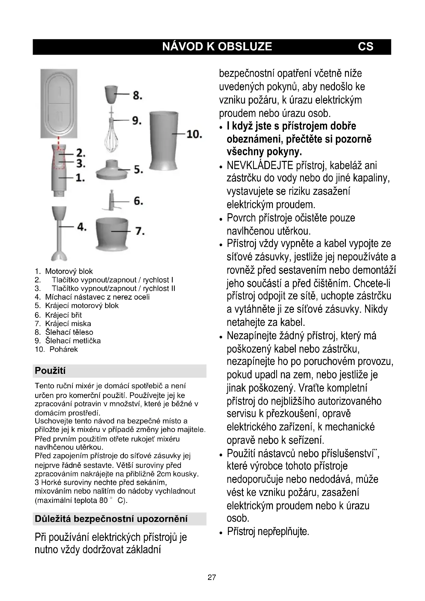 Použití Tento ruční mixér je domácí spotřebič a není určen pro komerční použití. Používejte jej ke zpracování potravin v množství, které je běžné v domácím prostředí. Uschovejte tento návod na bezpečné místo a přiložte jej k mixéru v případě změny jeho majitele. Před prvním použitím otřete rukojeť mixéru navlhčenou utěrkou. Před zapojením přístroje do síťové zásuvky jej nejprve řádně sestavte. Větší suroviny před zpracováním nakrájejte na přibližně 2cm kousky. 3 Horké suroviny nechte před sekáním, mixováním nebo nalitím do nádoby vychladnout (maximální teplota 80 °C). Důležitá bezpečnostní upozornění Při používání elektrických přístrojů je nutno vždy dodržovat základní bezpečnostní opatření včetně níže uvedených pokynů, aby nedošlo ke vzniku požáru, k úrazu elektrickým proudem nebo úrazu osob.