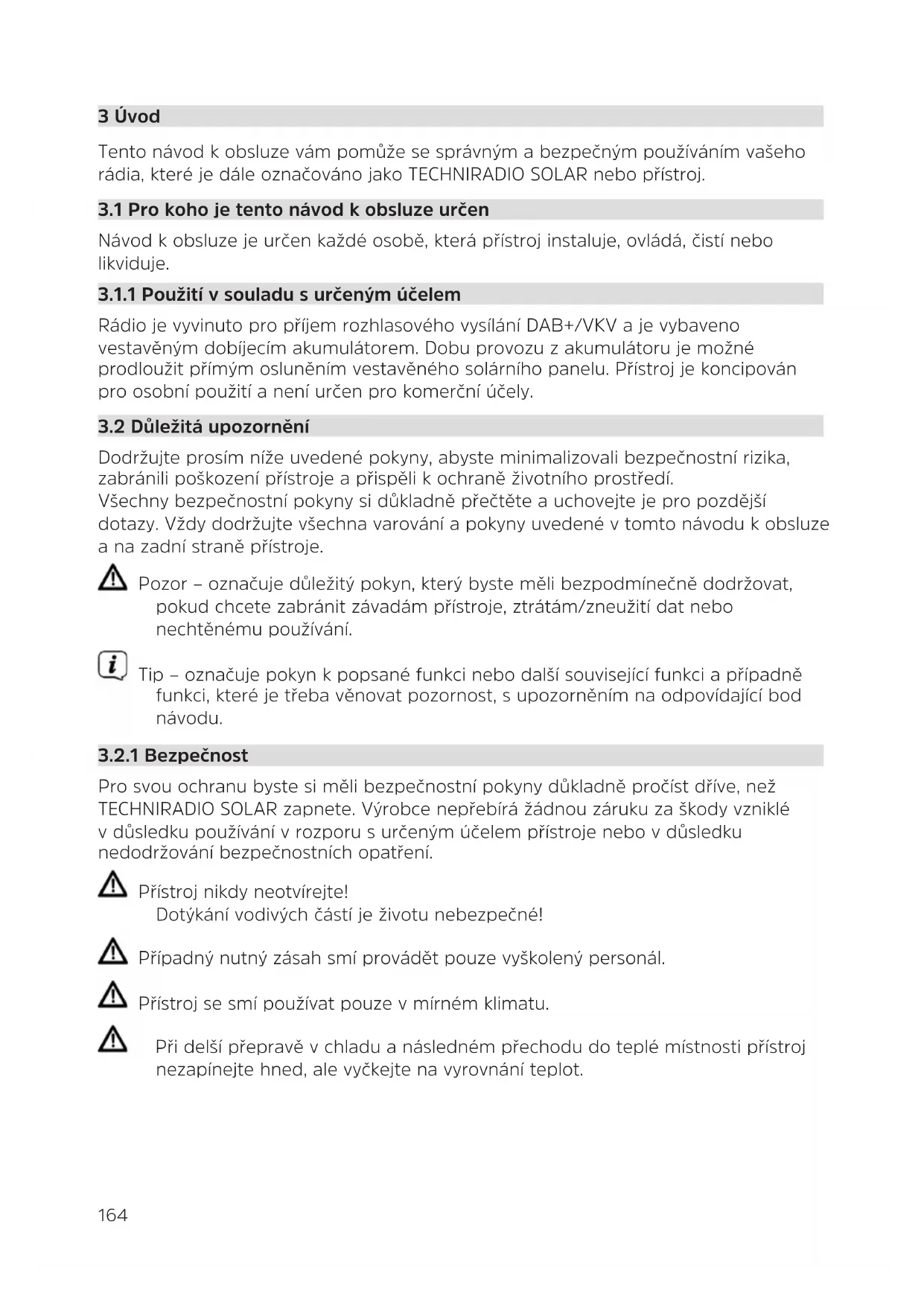 - 13 Poznámky 64 3 Úvod Tento návod k obsluze vám pomůže se správným a bezpečným používáním vašeho rádia, které je dále označováno jako TECHNIRADIO SOLAR nebo přístroj. p. 1831