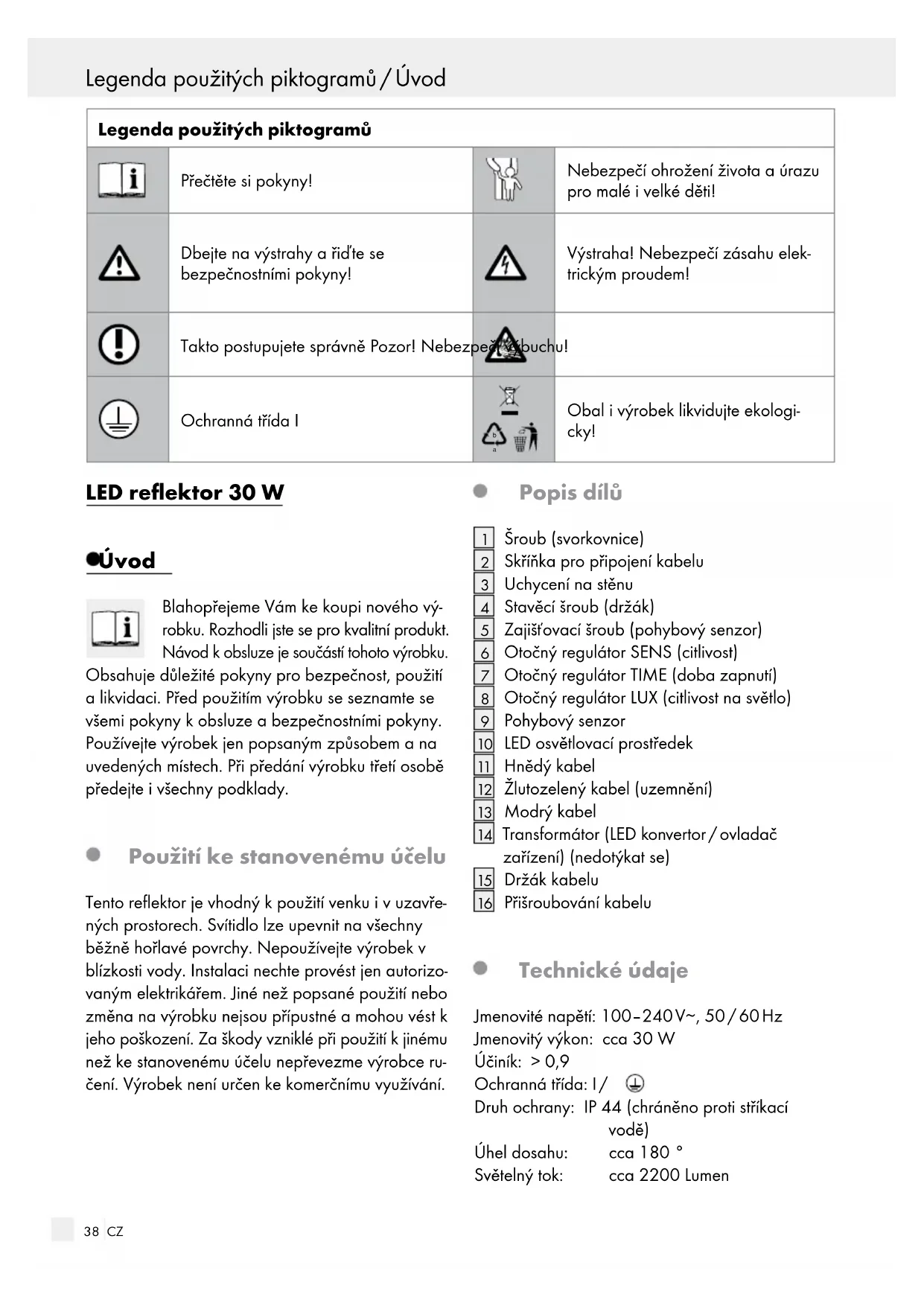 Přišroubování kabelu Technické údaje Jmenovité napětí: 100–240 V∼, 50 / 60 Hz Jmenovitý výkon: cca 30 W Účiník: > 0,9 Ochranná třída: I / Druh ochrany: IP 44 (chráněno proti stříkací vodě) Úhel dosahu: cca 180 ° Světelný tok: cca 2200 Lumen39 CZ Úvod / Bezpečnostní pokynyLegenda použitých piktogramů / Úvod Barevná teplota: cca 5000 K Spínací cykly: cca 15000 Velká osvětlená plocha: 0,045 m