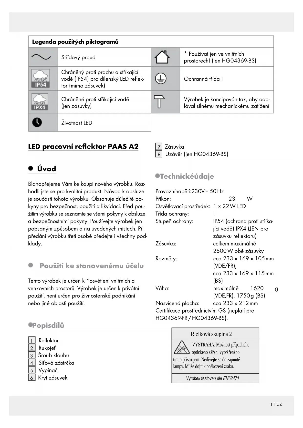 | IP54 | Chráněný proti prachu a stříkajíci vodě (IP54) pro dílenský LED reflektor (mimo zásuvek) | Ochranná třída I | |