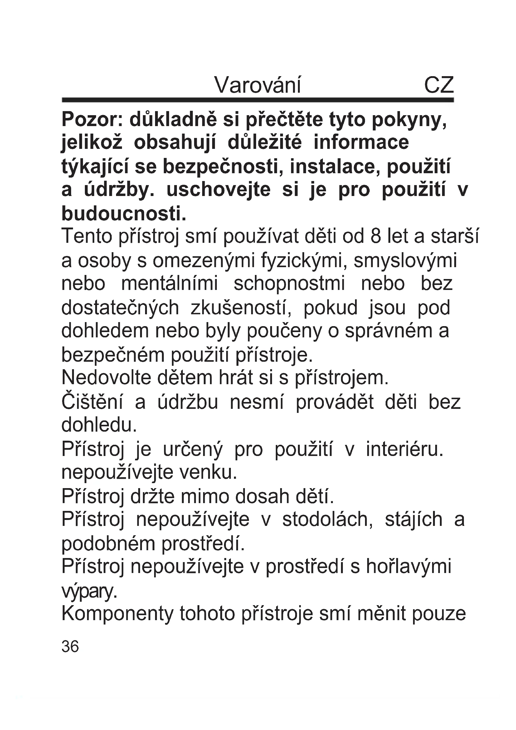 VAROVÁNÍ! Před použitím si přečtěte pokyny. Nedotýkejte se elektrickou mřížkou. Pouze pro použití v interiéru. Uschovejte si záruční list, doklad o koupi a návod k obsluze pro případné použití v budoucnosti. Po vybalení přístroje jej zkontrolujte z hlediska viditelného poškození a v případě poškození jej nepoužívejte a kontaktujte servis. Nenechávejte obalové materiály v dosahu dětí, není to hračka: je to elektrické zařízení a musí se s ním dle toho zacházet. Před připojením přístroje se ujistěte, zda napětí v elektrické síti odpovídá napětí na výrobním štítku. Nepoužívejte adaptéry ani prodlužovací kabely, které nevyhovují bezpečnostním standardům, nebo které překračují bezpečnostní limity. Pokud přístroj nepoužíváte, odpojte jej od elektrické sítě a ujistěte se, zda je vypnutý. Při odpojování přístroje netahejte za kabel. Použití elektrických přístrojů vyžaduje dodržování určitých pravidel, zejména: nedotýkejte se přístroje mokrýma nebo vlhkýma rukama; nepoužívejte přístroj, pokud máte bosé nohy; nevystavujte přístroj38 Technické informace (viz obrázek na poslední stránce) 1-Elektrickou mřížkou 2-Hák pro zavěšení 3-Aktinické světlo 4-Zásobníku hmyzu Informace o lampě Aktinické světlo určené pro lapání létající hmyz; světelný zdroj není určen k jinému použití. Pokyny pro použití Ekologická past na hmyz má speciální aktinické světlo, zcela neškodné, přitahující hmyz, který je zasažený elektrickým proudem při kontaktu s interní elektrickou mřížkou. Tato past je určená pouze pro použití v interiéru a nesmí se používat na místech s hořlavými materiály (jako jsou stodoly). Přístroj postavte na stabilní povrch. Připojte zástrčku k elektrické zásuvce. Přístroj umístěte nejméně 2 metry od osoby, abyste zabránili rušení hmyzem předtím, než bude zachycen v pasti. Nesměrujte přístroj na okna nebo dveře a jiné otvory venku, abyste zabránili přitahování hmyzu zvenčí. Nechte přístroj zapnutý během noci, aby se rozvinul skutečný účinek. Po použití vždy odpojte od sítě. povětrnostním vlivům (déšť, slunce); nevystavujte jej otřesům. V případě nestandardního provozu přístroje ihned odpojte zástrčku od elektrické sítě, nedotýkejte se přístroje a kontaktujte kvalikovaného servisního technika. Pokud již přístroj nebudete používat, učiňte jej nepoužitelným po odpojení od elektrické sítě. Přístroj byl navržen pro použití v domácím prostředí; jakékoliv jiné použití je nesprávné a nebezpečné. Nepoužívejte jej venku. Z bezpečnostních důvodů nesmíte přístroj demontovat. K zajištění bezpečnosti přístroje používejte pouze originální náhradní díly a příslušenství. PŘES OTVORY OCHRANNÉ MŘÍŽKY NEVKLÁDEJTE ŽÁDNÉ