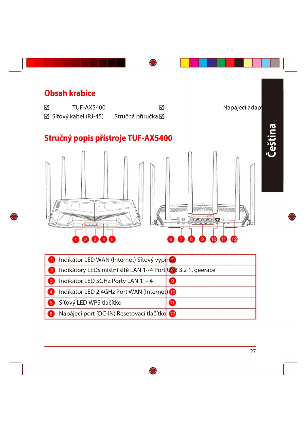 Stručný popis přístroje TUF-AX5400 Stručný popis přístroje TUF-AX5400 Obsah krabice Obsah krabice TUF-AX5400 Napájecí adaptér Síťový kabel (RJ-45) Stručná příručka Indikátor LED WAN (Internet) Síťový vypínač Indikátory LEDs místní sítě LAN 1~4 Port USB3.2 1.geerace Indikátor LED 5GHz Porty LAN 1 ~ 4 Indikátor LED 2,4GHz Port WAN (Internet) Síťový LED WPS tlačítko Napájecí port (DC-IN) Resetovací tlačítko ..Čeština
