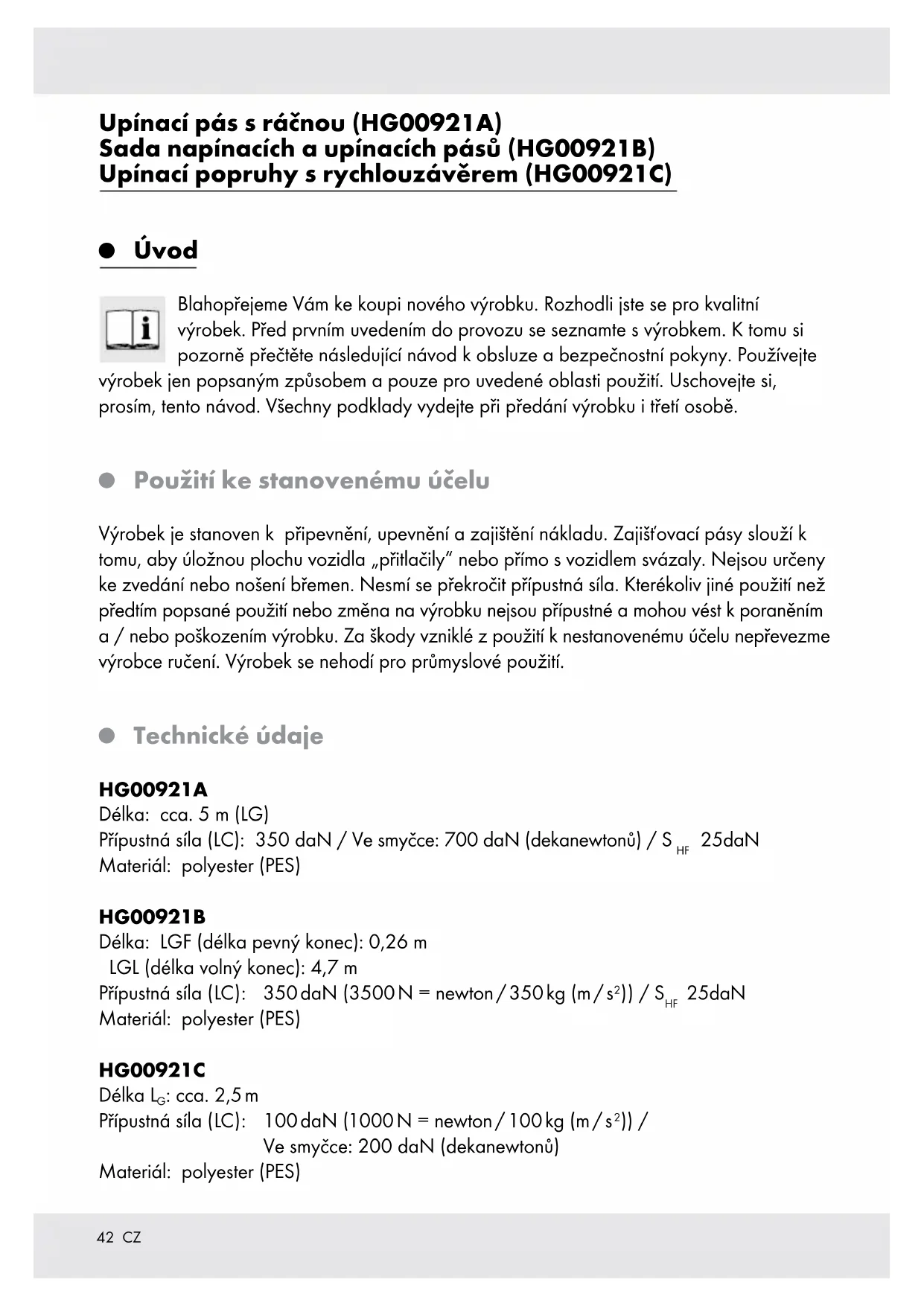 Rozsah dodávky Bezprostředně po rozbalení zkontrolujte úplnost dodávky a bezvadný stav výrobku a všech jeho částí. 1 x Upínací pás s ráčnou, cca. 5 m (HG00921A) 1 x zajišťovací popruh snapínací řehtačkou a s hákem S, cca. 0,26 m (HG00921B) 1 x zajišťovací popruh s hákem S, cca. 4,7 m (HG00921B) 2 x připevňovací popruh se svěracím zámkem, cca. 2,5 m (HG00921C) 1 x návod k obsluze