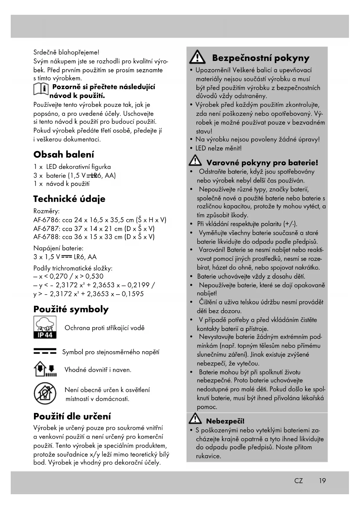 Výměna baterií Pokud baterie (2) už nefungují, můžete je vyměnit. Při výměně baterií postupujte podle popisu v čás- ti „Vložení baterií“. Před vložením nových baterií vyjměte staré baterie z prostoru pro baterie. Zapnutí a vypnutí světla (obr. B) Jedním stisknutím tlačítka (1c) aktivujete funkci časovače výrobku. Upozornění: Při aktivované funkci časovače bude světlo 6 hodin zapnuté a 18 hodin vypnu- té. Rytmus se denně opakuje. Pro zapnutí výrobku stiskněte tlačítko (1c) dvakrát. Pro vypnutí výrobku stiskněte tlačítko (1c) třikrát. Upozornění: V závislosti na aktivovaném režimu stačí stisknout tlačítko pro přechod do dalšího režimu jen jednou. Použití Výrobek lze umístit v interiéru nebo v chráněném venkovním prostoru. Upozornění: Neumisťujte výrobek na citlivých površích. Mohlo by dojít k jejich poškrábání. Uskladnění, čištění Pokud výrobek nepoužíváte, skladujte jej vždy suchý, čistý, bez baterií a při pokojové teplotě. Čistěte pouze vlhkým hadříkem a následně otřete do sucha. DŮLEŽITÉ! K čištění nikdy nepoužívejte agresivní čisticí prostředky. Pokyny k likvidaci V zájmu ochrany životního prostředí nevyhazujte svůj výrobek do odpadu v případě, že dosloužil, ale odneste jej na profesionální místo k likvidaci. O sběrných místech a jejich otevírací době se můžete informovat u příslušné místní správy. Vadné nebo použité baterie/akumulátory musejí být recyklovány v souladu se směrnicí 2006/66/ES a jejími změnami. Odevzdejte baterie/akumulátory a/nebo výrobek prostřednictvím nabízených sběrných zařízení. Balicí materiály jako např. fóliové pytle nepatří do rukou dětí. Uchovávejte balicí materiál mimo dosah dětí. Poškození životního prostředí v důsledku nesprávné likvidace baterií/ akumulátorů! Baterie/akumulátory nesmějí být likvidovány spolu s komunálním odpadem. Mohou obsahovat toxické těžké kovy a podléhají zpracování nebezpečného odpadu. Chemické symboly těžkých kovů jsou následující: Cd = kadmium, Hg = rtuť, Pb = olovo. Použité baterie/akumulátory proto likvidujte v místním sběrném místě. Výrobek a obal zlikvidujte ekologicky. Při třídění odpadu dodržujte označení balicích materiálů, které jsou označeny zkratkami (a) a čísly (b) s následujícím významem: 1–7: plasty/20–22: papír a karton/80–98: smíšený odpad. Výrobek a balicí materiály jsou recyklovatelné, likvidujte je odděleně pro lepší zpracování odpadu. Logo Triman platí pouze pro Francii. Možnosti likvidace výrobku, který dosloužil, jsou k dispozici u místní nebo městské správy. CZ21 Pokyny k záruce a průběhu služby Produkt byl vyrobený s velkou pečlivostí a byl průběžně kontrolovaný ve výrobní procesu. Na tento produkt obdržíte tříroční záruku ode dne zakoupení. Uschovejte si pokladní stvrzenku. Záruka se vztahuje jen na vady materiálu a chyby z výroby, nevztahuje se na závady způsobené neodborným zacházením nebo použitím k jinému účelu. Tato záruka neomezuje Vaše zákonná ani záruční práva. Při případných reklamacích se obraťte na dole uvedenou servisní horkou linku nebo nám zašlete email. Náš servisní pracovník s Vámi co nejrychleji upřesní další postup. V každém případě Vám osobně poradíme. Záruční doba se neprodlužuje po případných opravách v době záruky ani v případě zákon- ného ručení nebo kulance. Toto platí také pro náhradní a opravené díly. Opravy prováděné po vypršení záruční lhůty se platí. IAN: 323267_1901 Servis Česko Tel.: 800143873 E-Mail: deltasport@lidl.cz CZ22 Blahoželáme! Svojím nákupom ste sa rozhodli pre kvalitný výrobok. Pred prvým použitím sa s výrobkom dôkladne oboznámte. Pozorne si prečítajte tento návod na použivanie. Výrobok používajte len uvedeným spôsobom a na uvedený účel. Tento návod na použivanie si dobre uschovajte. Pri odovzdávaní výrobku tretej osobe odovzdajte s výrobkom aj všetky podklady. Rozsah dodávky 1 x LED dekoratívna figúrka 3 x batéria (1,5 V LR6, AA) 1 x návod na používanie Technické údaje Rozmery: AF-6786: cca 24 x 16,5 x 35,5 cm (Š x H x V) AF-6787: cca 37 x 14 x 21 cm (D x Š x V) AF-6788: cca 36 x 15 x 33 cm (D x Š x V) Prevádzka na batérie: 3 x 1,5 V LR6, AA Chromatické súradnice: — x < 0,270 / x > 0,530 — y < – 2,3172 x + 2,3653 x — 0,2199 / y > – 2,3172 x + 2,3653 x — 0,1595 Použité symboly Ochrana proti striekajúcej vode Symbol pre jednosmerné napätie Vhodné do interiéru a exteriéru. Výrobok nie je vhodný na všeobecné osvetlenie priestorov v domácnosti. Určené použitie Výrobok je určený len na súkromné účely v chrá- nenom interiéri a exteriéri a nie je určený na komerčné používanie. V prípade tohto výrobku ide o špeciálny výrobok, pretože súradnice x-/y sa nachádzajú mimo teoretického bieleho bodu. Výrobok je vhodný na dekoratívne účely. Bezpečnostné pokyny