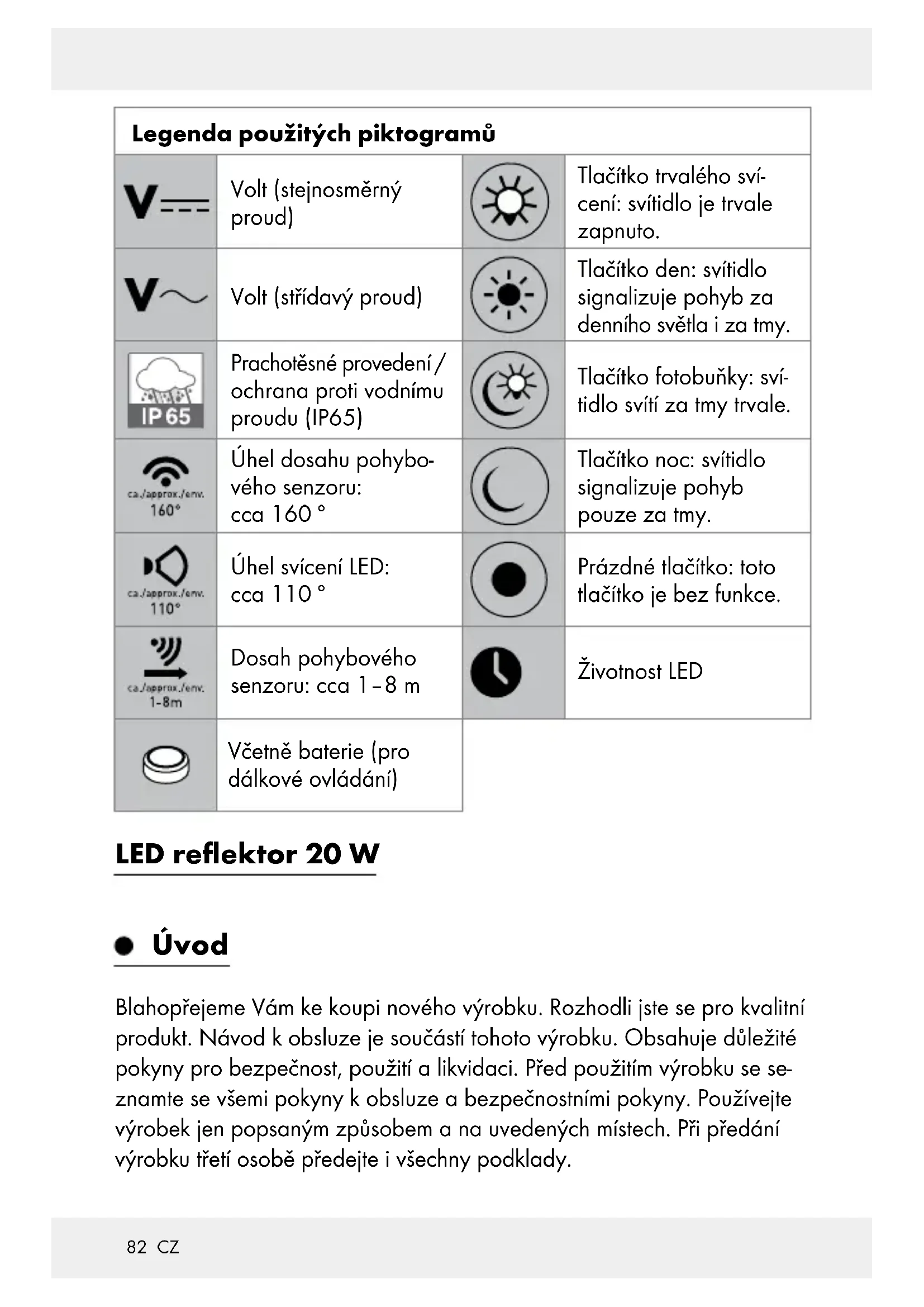 rachotěsné provede ní / ochrana proti vodnímu proudu (IP65) Tlačítko fotobuňky: sví- tidlo svítí za tmy trvale. Úhel dosahu pohybo- vého senzoru: cca 160 ° Tlačítko noc: svítidlo signalizuje pohyb pouze za tmy. Úhel svícení LED: cca 110 ° Prázdné tlačítko: toto tlačítko je bez funkce. Dosah pohybového senzoru: cca 1–8m Životnost LED Včetně baterie (pro dálkové ovládání) LED reflektor 20 W Úvod Blahopřejeme Vám ke koupi nového výrobku. Rozhodli jste se pro kvalitní produkt. Návod kobsluze je součástí tohoto výrobku. Obsahuje důležité pokyny pro bezpečnost, použití a likvidaci. Před použitím výrobku se se- znamte se všemi pokyny k obsluze a bezpečnostními pokyny. Používejte výrobek jen popsaným způsobem a na uvedených místech. Při předání výrobku třetí osobě předejte i všechny podklady.83 CZ Použití ke stanovenému účelu Tento výrobek je určen kosvětlení vnitřních a venkovních prostor. Výrobek je určen ksoukromému použití, není určen kživnostenskému podnikání nebo pro jinou oblast využití. Popis dílů
