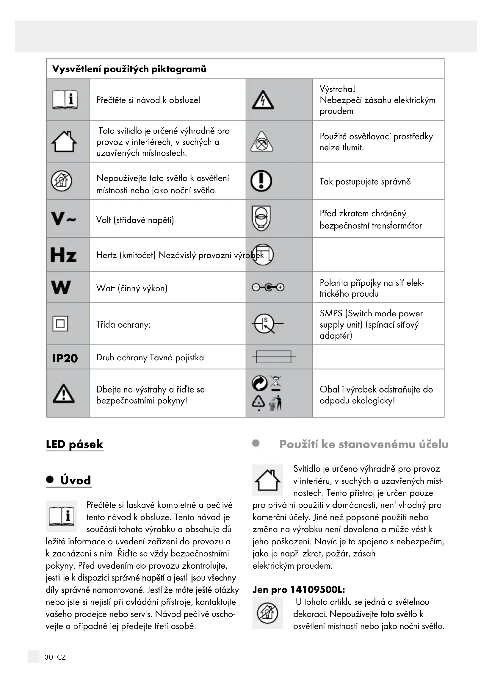 Obal i výrobek odstraňujte do odpadu ekologicky! LED pásek Úvod Přečtěte si laskavě kompletně a pečlivě tento návod k obsluze. Tento návod je součástí tohoto výrobku a obsahuje dů- ležité informace ouvedení zařízení do provozu a kzacházení sním. Řiďte se vždy bezpečnostními pokyny. Před uvedením do provozu zkontrolujte, jestli je kdispozici správné napětí a jestli jsou všechny díly správně namontované. Jestliže máte ještě otázky nebo jste si nejistí při ovládání přístroje, kontaktujte vašeho prodejce nebo servis. Návod pečlivě uscho- vejte a případně jej předejte třetí osobě. Použití ke stanovenému účelu Svítidlo je určeno výhradně pro provoz vinteriéru, vsuchých a uzavřených míst- nostech. Tento přístroj je určen pouze pro privátní použití v domácnosti, není vhodný pro komerční účely. Jiné než popsané použití nebo změna na výrobku není dovolena a může vést k jeho poškození. Navíc je to spojeno s nebezpečím, jako je např. zkrat, požár, zásah elektrickým proudem. Jen pro 14109500L: U tohoto artiklu se jedná o světelnou dekoraci. Nepoužívejte toto světlo k osvětlení místnosti nebo jako noční světlo.31 CZ Úvod / BezpečnostÚvod Obsah dodávky Bezprostředně po vybalení vždy zkontrolujte úplnost dodávky a bezvadný stav zařízení. 1 LED pásek 2 spojky 4 koncové krytky 2 držáky kabelu 1 lepící pásek 1 návod kobsluze Popis dílů