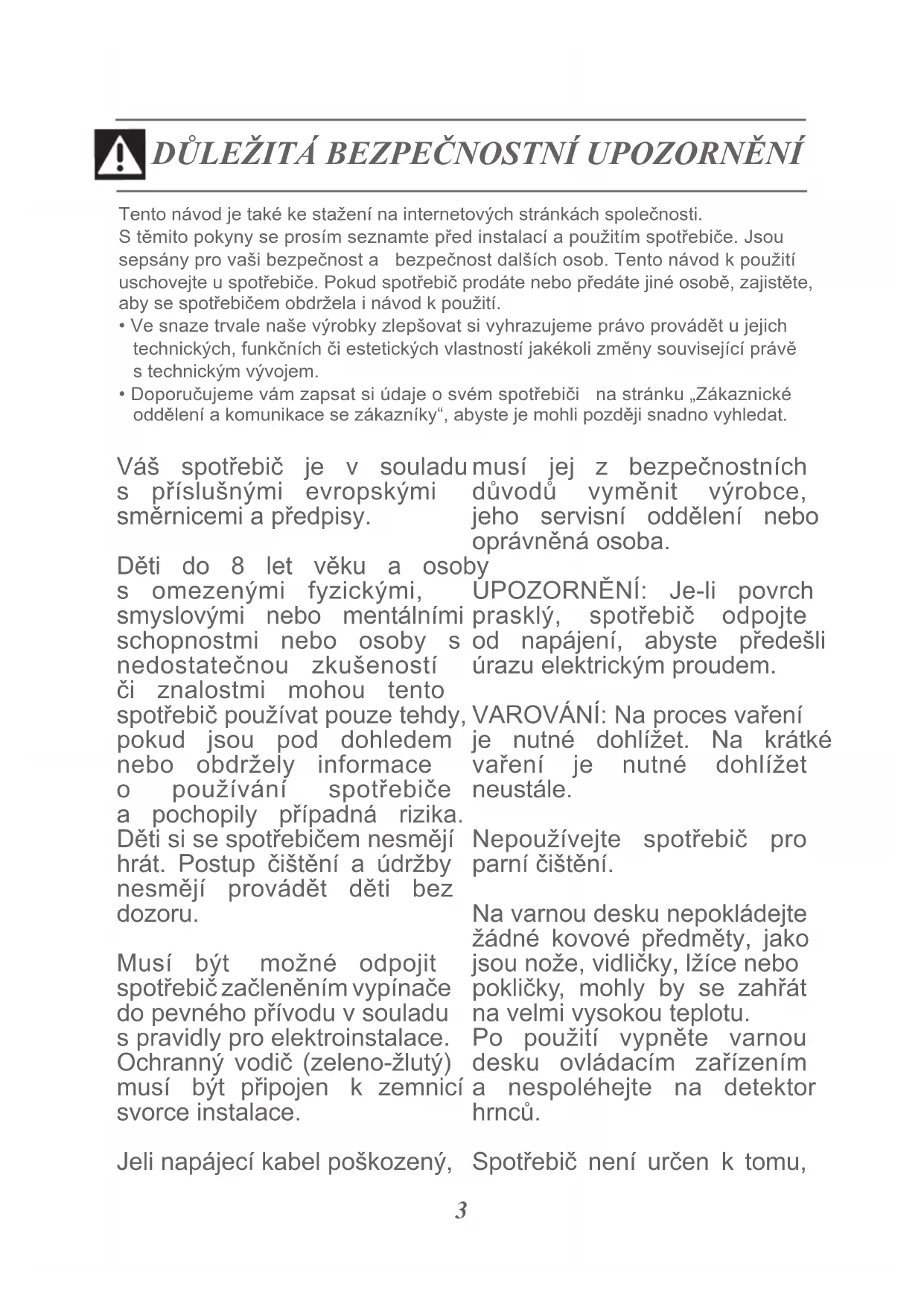 - Doporučujemevámzapsatsiúdajeosvémspotřebiči nastránku„Zákaznické odděleníakomunikacesezákazníky“,abystejemohlipozdějisnadnovyhledat. Váš spotřebič je v souladu s příslušnými evropskými směrnicemiapředpisy. Děti do 8 let věku a osoby s omezenými fyzickými, smyslovými nebo mentálními schopnostmi nebo osoby s nedostatečnou zkušeností či znalostmi mohou tento spotřebičpoužívatpouzetehdy, pokud jsou pod dohledem nebo obdržely informace o používání spotřebiče a pochopily případná rizika. Dětisisespotřebičemnesmějí hrát. Postup čištění a údržby nesmějí provádět děti bez dozoru. Musí být možné odpojit spotřebičzačleněnímvypínače dopevnéhopřívoduvsouladu spravidlyproelektroinstalace. Ochrannývodič(zeleno-žlutý) musí být připojen k zemnicí svorceinstalace. Jelinapájecíkabelpoškozený, musí jej z bezpečnostních důvodů vyměnit výrobce, jeho servisní oddělení nebo oprávněnáosoba. UPOZORNĚNÍ: Je-li povrch prasklý, spotřebič odpojte od napájení, abyste předešli úrazuelektrickýmproudem. VAROVÁNÍ:Naprocesvaření je nutné dohlížet. Na krátké vaření je nutné dohlížet neustále. Nepoužívejte spotřebič pro parníčištění. Navarnoudeskunepokládejte žádné kovové předměty, jako jsounože,vidličky,lžícenebo pokličky, mohly by se zahřát navelmivysokouteplotu. Po použití vypněte varnou desku ovládacím zařízením a nespoléhejte na detektor hrnců. Spotřebič není určen k tomu,4 aby se zapínal externím časovačem nebo nezávislým systémemdálkovéhoovládání. Tento spotřebič je určen výhradně k instalaci do pracovnídesky. UPOZORNĚNÍ: Vaření bez dozoru na varné desce při používání tuku nebo oleje může být nebezpečné a může způsobit požár. Nikdy se nepokoušejte hasit požár vodou, ale nejprve vypněte napájeníspotřebičeanásledně zakryjteplamennapř.nějakou pokrývkounebohasicídekou. UPOZORNĚNÍ: Riziko požáru: Na varný povrch nic neodkládejte. Nedoporučujeme připojení varné desky přes proudový chránič. Použití nevhodných ochranmůžezpůsobitzranění čipoškození. Spotřebič a jeho přístupné částijsoupřipoužíváníhorké. Děti do 8 let věku se musí zdržovat v bezpečné vzdálenostinebomusíbýtpod stálýmdohledem.