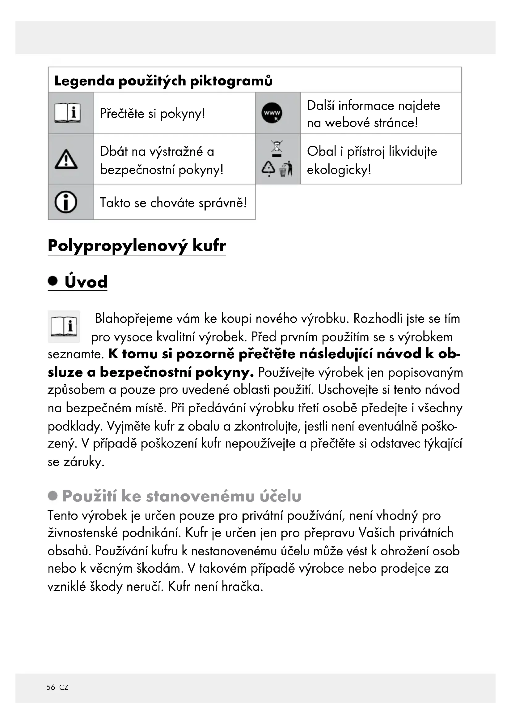 Pokyny týkajúce sa používania a bezpečnosti POLYPROPYLENOVÝ KUFR Pokyny k použití a bezpečnostní upozornění