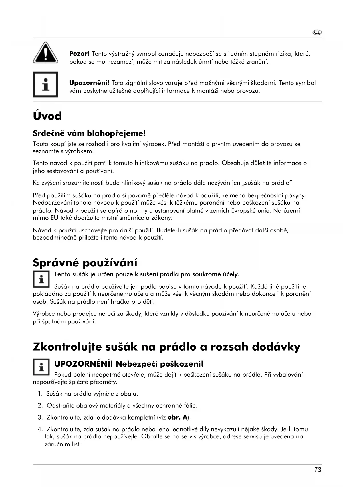 Tento sušák je určen pouze k sušení prádla pro soukromé účely. Sušák na prádlo používejte jen podle popisu v tomto návodu k použití. Každé jiné použití je pokládáno za použití k neurčenému účelu a může vést k věcným škodám nebo dokonce i k poranění osob. Sušák na prádlo není hračka pro děti. Výrobce nebo prodejce neručí za škody, které vznikly v důsledku používání k neurčenému účelu nebo při špatném používání. Zkontrolujte sušák na prádlo a rozsah dodávky
