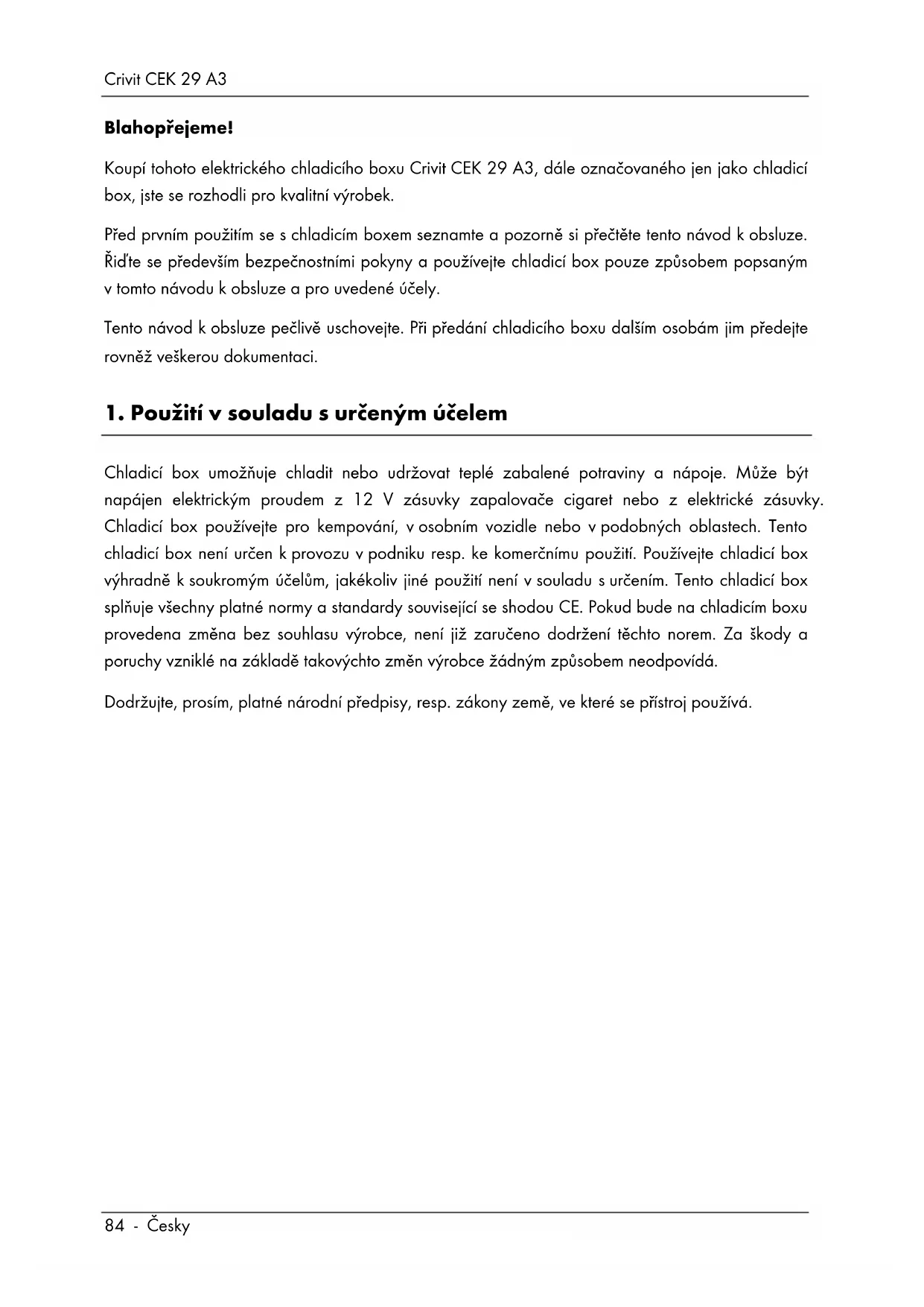 Blahopřejeme! Koupí tohoto elektrického chladicího boxu Crivit CEK 29 A3, dále označovaného jen jako chladicí box, jste se rozhodli pro kvalitní výrobek. Před prvním použitím se s chladicím boxem seznamte a pozorně si přečtěte tento návod k obsluze. Řiďte se především bezpečnostními pokyny a používejte chladicí box pouze způsobem popsaným v tomto návodu k obsluze a pro uvedené účely. Tento návod k obsluze pečlivě uschovejte. Při předání chladicího boxu dalším osobám jim předejte rovněž veškerou dokumentaci.