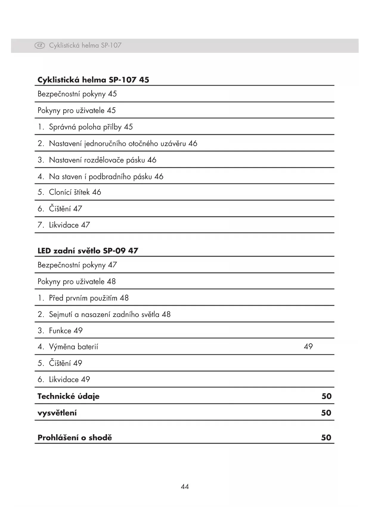 LED zadní světlo SP-09 47 Bezpečnostní pokyny 47 Pokyny pro uživatele 48