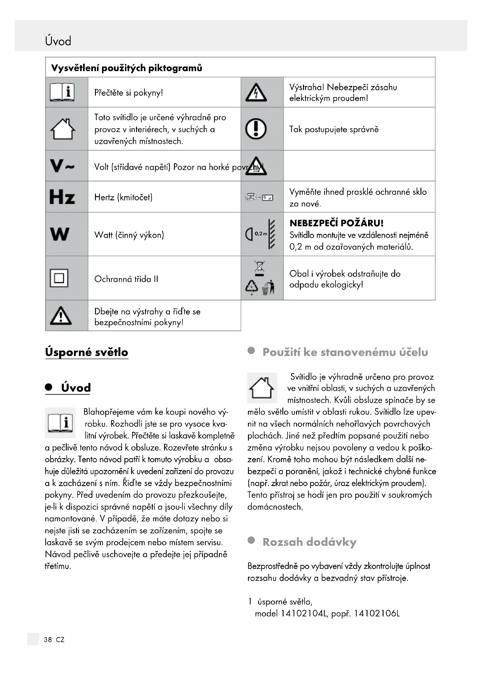 Rozsah dodávky Bezprostředně po vybavení vždy zkontrolujte úplnost rozsahu dodávky a bezvadný stav přístroje. 1 úsporné světlo, model 14102104L, popř. 14102106L39 CZ Úvod / Bezpečnost 1 zářivka T 5, 13 W 1 napájecí kabel 1 spojovací kabel 2 hmoždíky 2 šrouby 1 návod k obsluze