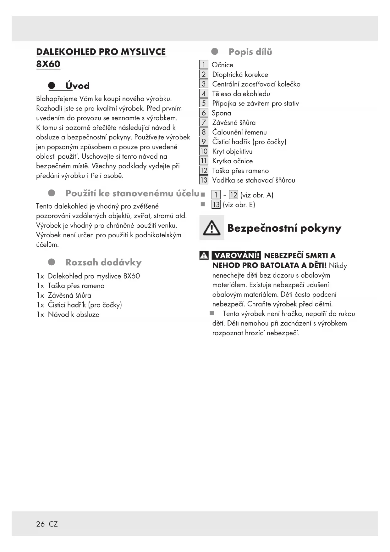 8X60 Úvod Blahopřejeme Vám ke koupi nového výrobku. Rozhodli jste se pro kvalitní výrobek. Před prvním uvedením do provozu se seznamte s výrobkem. K tomu si pozorně přečtěte následující návod k obsluze a bezpečnostní pokyny. Používejte výrobek jen popsaným způsobem a pouze pro uvedené oblasti použití. Uschovejte si tento návod na bezpečném místě. Všechny podklady vydejte při předání výrobku i třetí osobě. Použití ke stanovenému účelu Tento dalekohled je vhodný pro zvětšené pozorování vzdálených objektů, zvířat, stromů atd. Výrobek je vhodný pro chráněné použití venku. Výrobek není určen pro použití k podnikatelským účelům. Rozsah dodávky 1x Dalekohled pro myslivce 8X60 1x Taška přes rameno 1x Závěsná šňůra 1x Čisticí hadřík (pro čočky) 1x Návod k obsluze Popis dílů [1] Očnice [2] Dioptrická korekce [3] Centrální zaostřovací kolečko [4] Těleso dalekohledu [5] Přípojka se závitem pro stativ [6] Spona [7] Závěsná šňůra [8] Čalounění řemenu [9] Čisticí hadřík (pro čočky) [] Kryt objektivu [] Krytka očnice [] Taška přes rameno [] Vodítka se stahovací šňůrou [1] ‒[] (viz obr.A) [] (viz obr.E) Bezpečnostní pokyny