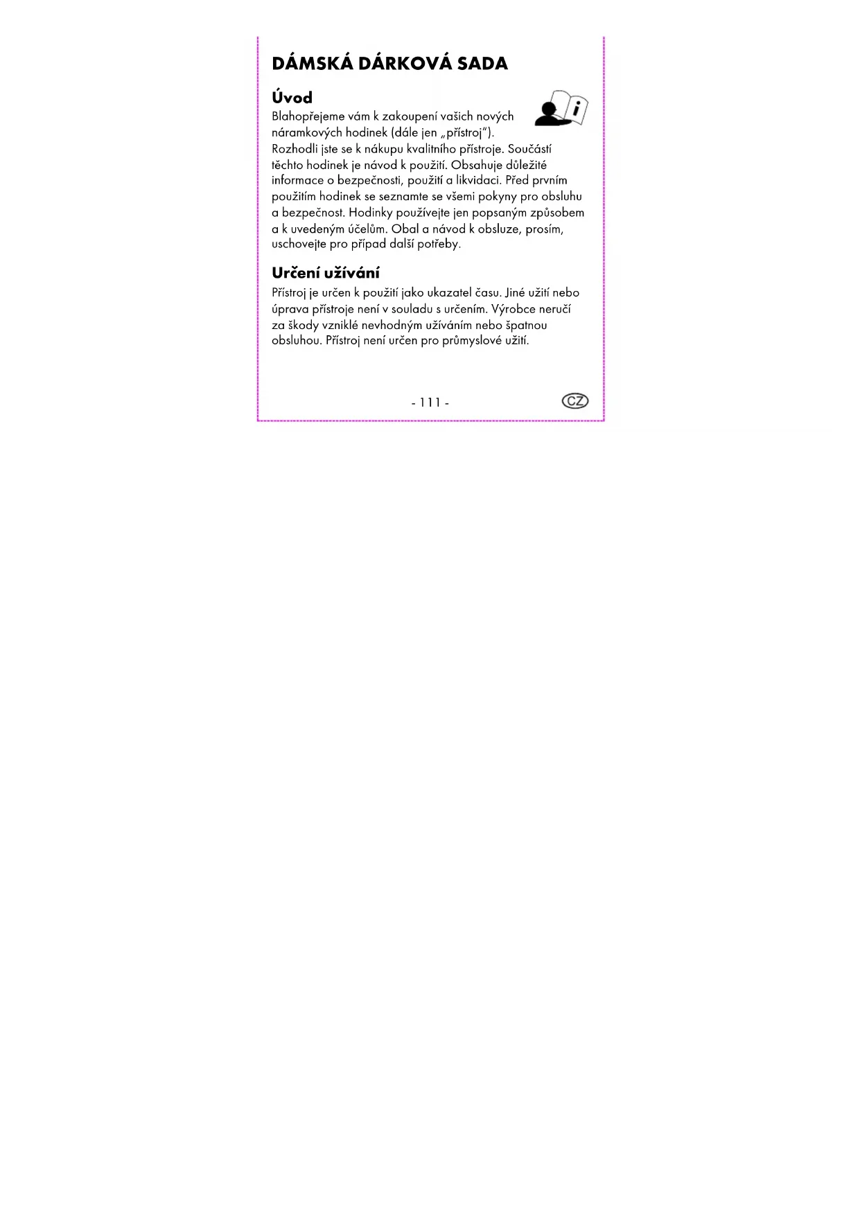 Úvod Blahopřejeme vám k zakoupení vašich nových náramkových hodinek (dále jen „přístroj“). Rozhodli jste se k nákupu kvalitního přístroje. Součástí těchto hodinek je návod k použití. Obsahuje důležité informace o bezpečnosti, použití a likvidaci. Před prvním použitím hodinek se seznamte se všemi pokyny pro obsluhu a bezpečnost. Hodinky používejte jen popsaným způsobem a k uvedeným účelům. Obal a návod k obsluze, prosím, uschovejte pro případ další potřeby. Určení užívání Přístroj je určen k použití jako ukazatel času. Jiné užití nebo úprava přístroje není v souladu s určením. Výrobce neručí za škody vzniklé nevhodným užíváním nebo špatnou obsluhou. Přístroj není určen pro průmyslové užití.- 112 - Rozsah dodávky Upozornění: Po zakoupení prosím zkontrolujte rozsah dodávky. Zjistěte prosím, zda jsou v balení všechny díly a zda nejsou poškozené. 1 x Náramkové hodinky včetně baterie 3 x Náramek pro modely 1 2 x Náramek pro model 2 1 x Náramek pro modelky 3 + 4 1 x Uživatelský manuál Technické údaje Hodinky quartz Baterie typu 1,55 V, SR626SW- 113 - Vysvětlivky symbolů