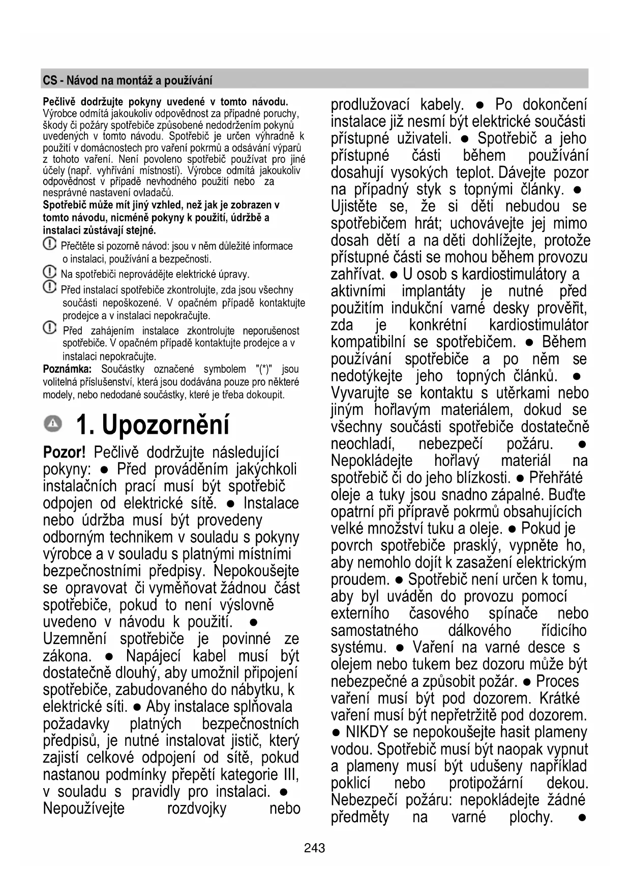 Pozor! Pečlivě dodržujte následující pokyny: ● Před prováděním jakýchkoli instalačních prací musí být spotřebič odpojen od elektrické sítě. ● Instalace nebo údržba musí být provedeny odborným technikem v souladu s pokyny výrobce a v souladu s platnými místními bezpečnostními předpisy. Nepokoušejte se opravovat či vyměňovat žádnou část spotřebiče, pokud to není výslovně uvedeno v návodu k použití. ● Uzemnění spotřebiče je povinné ze zákona. ● Napájecí kabel musí být dostatečně dlouhý, aby umožnil připojení spotřebiče, zabudovaného do nábytku, k elektrické síti. ● Aby instalace splňovala požadavky platných bezpečnostních předpisů, je nutné instalovat jistič, který zajistí celkové odpojení od sítě, pokud nastanou podmínky přepětí kategorie III, v souladu s pravidly pro instalaci. ● Nepoužívejte rozdvojky nebo prodlužovací kabely. ● Po dokončení instalace již nesmí být elektrické součásti přístupné uživateli. ● Spotřebič a jeho přístupné části během používání dosahují vysokých teplot. Dávejte pozor na případný styk s topnými články. ● Ujistěte se, že si děti nebudou se spotřebičem hrát; uchovávejte jej mimo dosah dětí a na děti dohlížejte, protože přístupné části se mohou během provozu zahřívat. ● U osob s kardiostimulátory a aktivními implantáty je nutné před použitím indukční varné desky prověřit, zda je konkrétní kardiostimulátor kompatibilní se spotřebičem. ● Během používání spotřebiče a po něm se nedotýkejte jeho topných článků. ● Vyvarujte se kontaktu s utěrkami nebo jiným hořlavým materiálem, dokud se všechny součásti spotřebiče dostatečně neochladí, nebezpečí požáru. ● Nepokládejte hořlavý materiál na spotřebič či do jeho blízkosti. ● Přehřáté oleje a tuky jsou snadno zápalné. Buďte opatrní při přípravě pokrmů obsahujících velké množství tuku a oleje. ● Pokud je povrch spotřebiče prasklý, vypněte ho, aby nemohlo dojít k zasažení elektrickým proudem. ● Spotřebič není určen k tomu, aby byl uváděn do provozu pomocí externího časového spínače nebo samostatného dálkového řídicího systému. ● Vaření na varné desce s olejem nebo tukem bez dozoru může být nebezpečné a způsobit požár. ● Proces vaření musí být pod dozorem. Krátké vaření musí být nepřetržitě pod dozorem. ● NIKDY se nepokoušejte hasit plameny vodou. Spotřebič musí být naopak vypnut a plameny musí být udušeny například poklicí nebo protipožární dekou. Nebezpečí požáru: nepokládejte žádné předměty na varné plochy. ●244 Nepoužívejte parní čističe, hrozí nebezpečí úrazu elektrickým proudem. ● Na povrch varné desky neumisťujte kovové předměty, jako jsou nože, vidličky, lžíce a víka, protože by se mohly přehřát. ● Před připojením spotřebiče k elektrické síti: zkontrolujte typový štítek (umístěný na spodní straně spotřebiče), aby se ujistili, že napětí a výkon odpovídají napětí v síti a připojovací zásuvka je vhodného typu. V případě pochyb se obraťte na kvalifikovaného elektrikáře. Důležité: ● Po použití varnou desku vypněte pomocí ovládacího zařízení a nespoléhejte se na detektor hrnců. ● Vyvarujte se přelití tekutiny, a proto při vaření nebo ohřevu tekutin snižte přívod tepla. ● Neponechávejte zapnuté topné články s prázdnými hrnci a pánvemi nebo bez nádob. ● Po dokončení vaření vypněte relativní varnou zónu. ● Nikdy k vaření nepoužívejte alobal a nikdy přímo neumísťujte výrobky zabalené v hliníkové fólii. Alobal by se mohl roztavit a došlo by k vážnému poškození vašeho spotřebiče. ● Nikdy neohřívejte ještě zavřené potravinové konzervy či plechovky: mohly by vybouchnout! Tato upozornění jsou platná i pro všechny ostatní typy varných desek. ● Použití vysokého výkonu, jako při funkci Booster, není vhodné pro ohřev určitých typů tekutin, jako například oleje na smažení. Přílišná teplota by mohla být nebezpečná. V těchto případech doporučujeme používat nižší výkon. ● Nádoby musí být umístěny přímo na varnou desku a musí být vystředěny. V žádném případě nevkládejte mezi hrnce a varnou desku jiné předměty. ● V případě vysokých teplot spotřebič automaticky snižuje úroveň výkonu varných zón. ● Před jakýmkoli čištěním nebo údržbou odpojte spotřebič od napájení odpojením zástrčky nebo odpojením hlavního vypínače obydlí. ● Při všech instalacích a údržbě používejte pracovní rukavice. ● Spotřebič mohou používat děti ve věku nejméně 8 let a osoby se sníženými fyzickými, smyslovými nebo mentálními schopnostmi nebo bez zkušeností či potřebných znalostí, za předpokladu, že jsou pod dohledem nebo poté, co obdržely pokyny týkající se bezpečného používání spotřebiče a pochopily s tím související nebezpečí. ● Děti musí být pod dozorem, aby si se spotřebičem nehrály. ● Čištění a údržbu nesmí provádět děti bez dozoru. ● Místnost musí mít dostatečné větrání, pokud je spotřebič používán současně s jinými spotřebiči na plyn nebo jiné palivo. ● Spotřebič musí být často čištěn zevnitř i zvenku (ALESPOŇ JEDNOU MĚSÍČNĚ), v každém případě dodržujte to, co je výslovně uvedeno v pokynech pro údržbu. ● Nedodržení pravidel pro čištění spotřebiče a pro výměnu a čištění filtrů představuje nebezpečí požáru. ● Vaření plamenem (flambování) je přísně zakázáno. ● Použití volných plamenů je nebezpečné pro filtry a mohlo by způsobit požár, a proto je třeba se ho v každém případě vyvarovat. ● Smažení se musí provádět pod kontrolou,