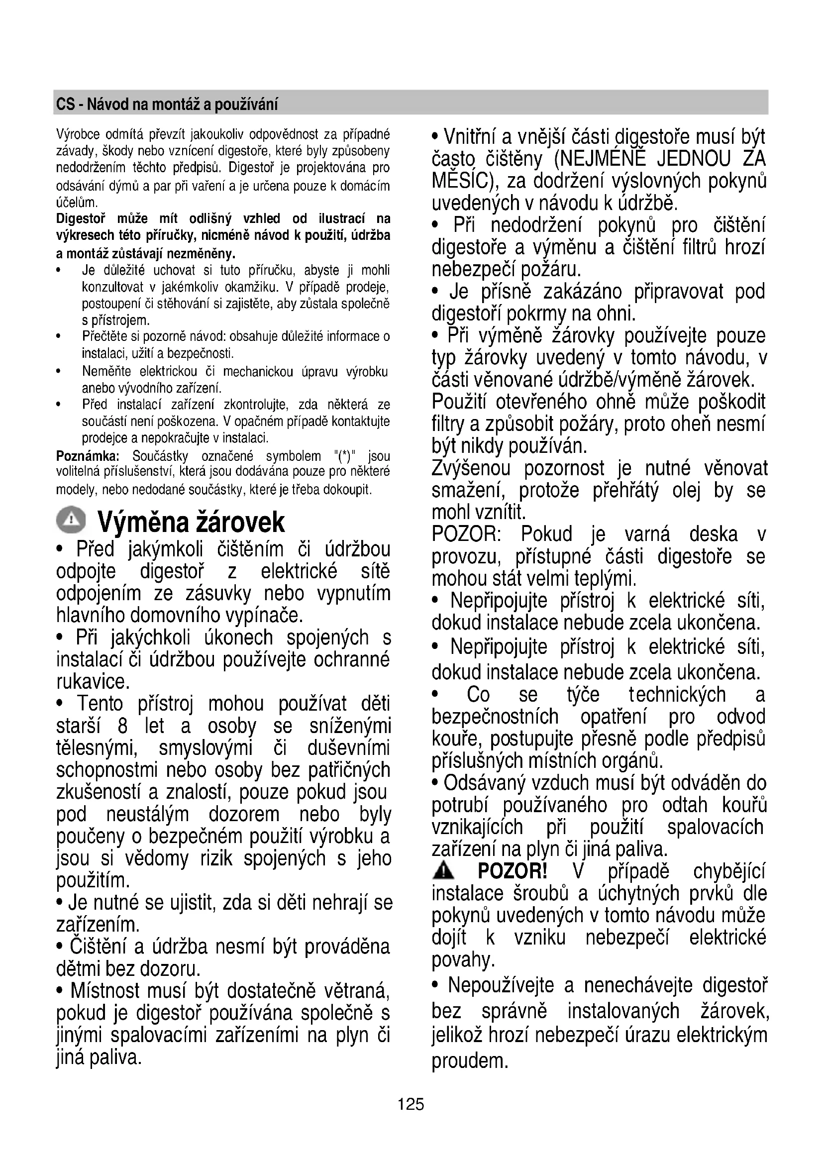 - Při výměně žárovky používejte pouze typ žárovky uvedený v tomto návodu, v části věnované údržbě/výměně žárovek. Použití otevřeného ohně může poškodit filtry a způsobit požáry, proto oheň nesmí být nikdy používán. Zvýšenou pozornost je nutné věnovat smažení, protože přehřátý olej by se mohl vznítit. POZOR: Pokud je varná deska v provozu, přístupné části digestoře se mohou stát velmi teplými.