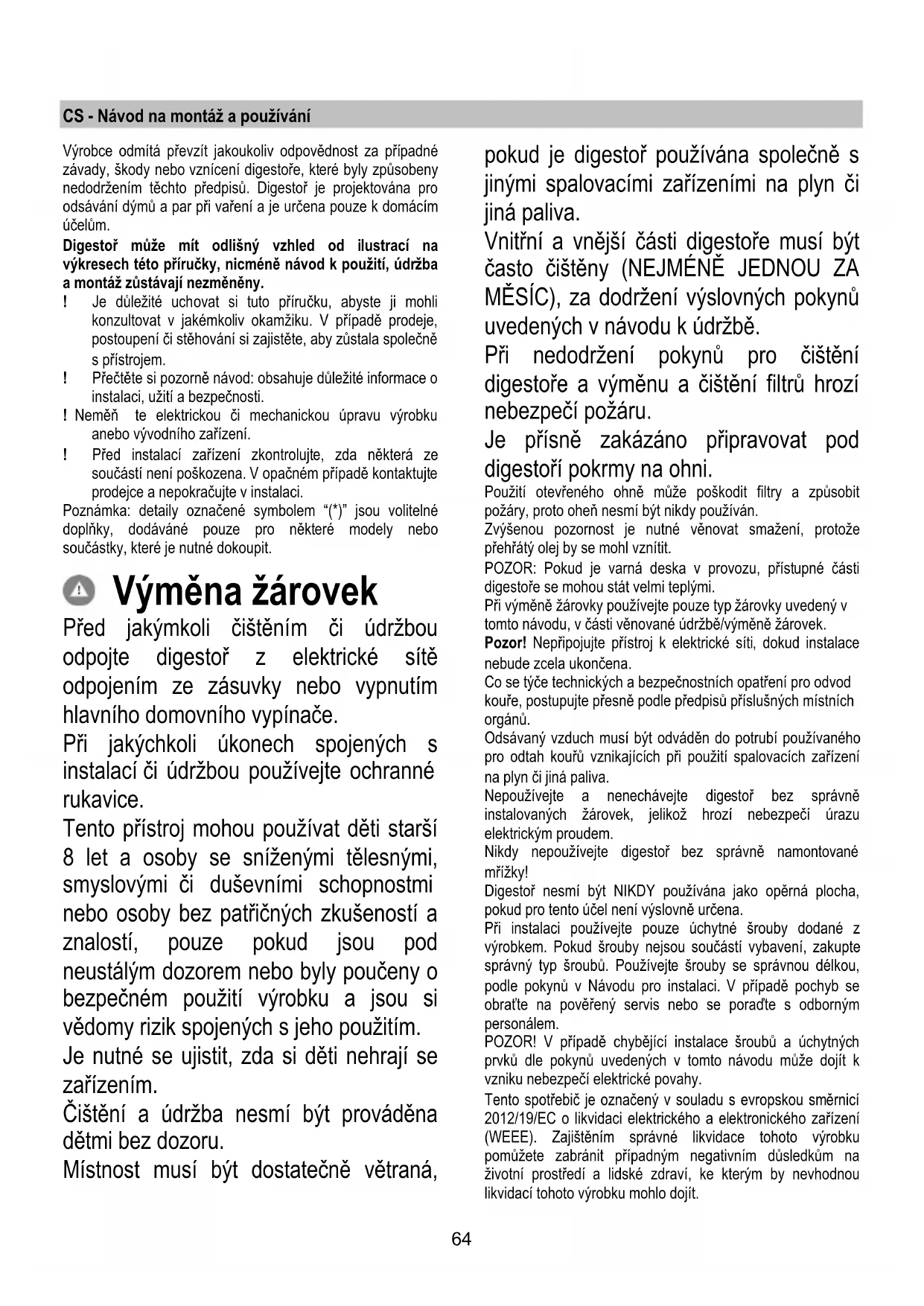 W przypadku, gdy oświetlenie nie działa należy najpierw sprawdzić, czy lampki zostały prawidłowo zamontowane. Jeżeli po przeprowadzeniu takiej kontroli oświetlenie nadal nie działa, należy zwrócić się do serwisu. - Model z lampami LED Okap zaopatrzony jest w system oświetlenia, który bazuje się na technologii LED. LED gwarantują optymalne oświetlenie, trwałość 10 razy większą od lamp tradycyjnych i pozwalają zaoszczędzić 90% energii elektrycznej. W celu wymiany należy zwrócić się do serwisu obsługi technicznej.64 CS - Návod na montáž a používání Výrobce odmítá převzít jakoukoliv odpovědnost za případné závady, škody nebo vznícení digestoře, které byly způsobeny nedodržením těchto předpisů. Digestoř je projektována pro odsávání dýmů a par při vaření a je určena pouze k domácím účelům. Digestoř může mít odlišný vzhled od ilustrací na výkresech této příručky, nicméně návod k použití, údržba a montáž zůstávají nezměněny. ! Je důležité uchovat si tuto příručku, abyste ji mohli konzultovat v jakémkoliv okamžiku. V případě prodeje, postoupení či stěhování si zajistěte, aby zůstala společně s přístrojem. ! Přečtěte si pozorně návod: obsahuje důležité informace o instalaci, užití a bezpečnosti. ! Neměň te elektrickou či mechanickou úpravu výrobku anebo vývodního zařízení. ! Před instalací zařízení zkontrolujte, zda některá ze součástí není poškozena. V opačném případě kontaktujte prodejce a nepokračujte v instalaci. Poznámka: detaily označené symbolem “(*)” jsou volitelné doplňky, dodáváné pouze pro některé modely nebo součástky, které je nutné dokoupit. Výměna žárovek Před jakýmkoli čištěním či údržbou odpojte digestoř z elektrické sítě odpojením ze zásuvky nebo vypnutím hlavního domovního vypínače. Při jakýchkoli úkonech spojených s instalací či údržbou používejte ochranné rukavice. Tento přístroj mohou používat děti starší 8 let a osoby se sníženými tělesnými, smyslovými či duševními schopnostmi nebo osoby bez patřičných zkušeností a znalostí, pouze pokud jsou pod neustálým dozorem nebo byly poučeny o bezpečném použití výrobku a jsou si vědomy rizik spojených s jeho použitím. Je nutné se ujistit, zda si děti nehrají se zařízením. Čištění a údržba nesmí být prováděna dětmi bez dozoru. Místnost musí být dostatečně větraná, pokud je digestoř používána společně s jinými spalovacími zařízeními na plyn či jiná paliva. Vnitřní a vnější části digestoře musí být často čištěny (NEJMÉNĚ JEDNOU ZA MĚSÍC), za dodržení výslovných pokynů uvedených v návodu k údržbě. Při nedodržení pokynů pro čištění digestoře a výměnu a čištění filtrů hrozí nebezpečí požáru. Je přísně zakázáno připravovat pod digestoří pokrmy na ohni. Použití otevřeného ohně může poškodit filtry a způsobit požáry, proto oheň nesmí být nikdy používán. Zvýšenou pozornost je nutné věnovat smažení, protože přehřátý olej by se mohl vznítit. POZOR: Pokud je varná deska v provozu, přístupné části digestoře se mohou stát velmi teplými. Při výměně žárovky používejte pouze typ žárovky uvedený v tomto návodu, v části věnované údržbě/výměně žárovek. Pozor! Nepřipojujte přístroj k elektrické síti, dokud instalace nebude zcela ukončena. Co se týče technických a bezpečnostních opatření pro odvod kouře, postupujte přesně podle předpisů příslušných místních orgánů. Odsávaný vzduch musí být odváděn do potrubí používaného pro odtah kouřů vznikajících při použití spalovacích zařízení na plyn či jiná paliva. Nepoužívejte a nenechávejte digestoř bez správně instalovaných žárovek, jelikož hrozí nebezpečí úrazu elektrickým proudem. Nikdy nepoužívejte digestoř bez správně namontované mřížky! Digestoř nesmí být NIKDY používána jako opěrná plocha, pokud pro tento účel není výslovně určena. Při instalaci používejte pouze úchytné šrouby dodané z výrobkem. Pokud šrouby nejsou součástí vybavení, zakupte správný typ šroubů. Používejte šrouby se správnou délkou, podle pokynů v Návodu pro instalaci. V případě pochyb se obraťte na pověřený servis nebo se poraďte s odborným personálem. POZOR! V případě chybějící instalace šroubů a úchytných prvků dle pokynů uvedených v tomto návodu může dojít k vzniku nebezpečí elektrické povahy. Tento spotřebič je označený v souladu s evropskou směrnicí 2012/19/EC o likvidaci elektrického a elektronického zařízení (WEEE). Zajištěním správné likvidace tohoto výrobku pomůžete zabránit případným negativním důsledkům na životní prostředí a lidské zdraví, ke kterým by nevhodnou likvidací tohoto výrobku mohlo dojít.65 Symbol na výrobku nebo na dokumentech přiložených k výrobku udává, že tento spotřebič nepatří do domácího odpadu. Spotřebič je nutné odvézt do sběrného místa pro recyklaci elektrického a elektronického zařízení. Likvidace musí být provedena v souladu s místními předpisy o ochraně životního prostředí, které se týkají likvidace odpadu. Podrobnější informace o zpracování, rekuperaci a recyklaci tohoto výrobku zjistíte u příslušného místního úřadu, služby pro likvidaci domovního odpadu nebo v obchodě, kde jste výrobek zakoupili. Přístroj byl navržen, testován a vyroben v souladu s:
