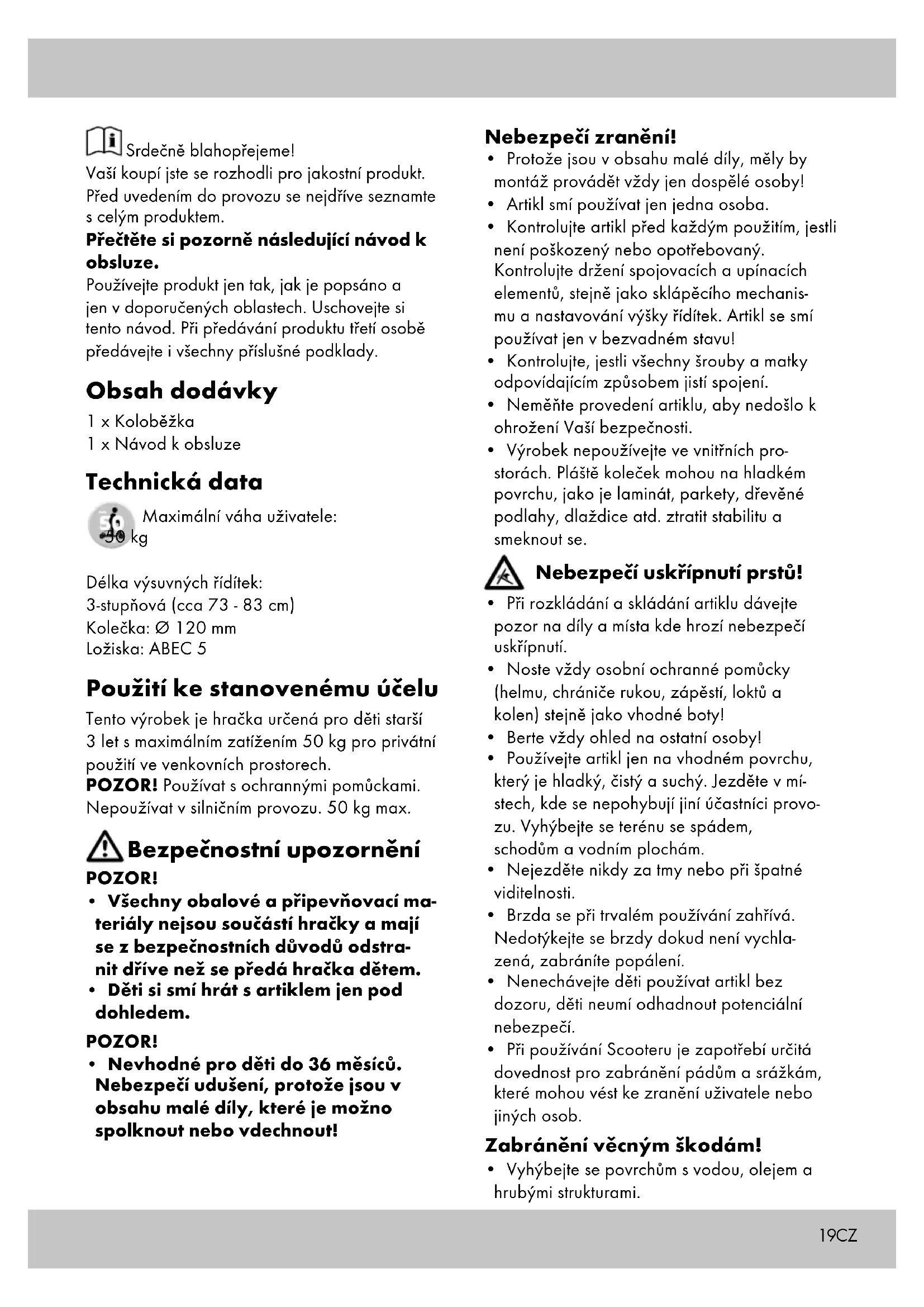 - Bevestig de wielen weer. Onderhoud, opbergen Na gebruik van het product raden wij u aan het grondig te reinigen en te drogen. Verwijder kleine steentjes of andere voorwer- pen, die eventueel aan de wielen vastzitten. Natte of vochtige kogellagers met een schone doek afdrogen. Vet de lagers met een geschikt lagervet van buiten in, om het ontstaan van roest aan de buitenkant te vermijden. Bewaar het product altijd op een droge plek.19CZ Srdečně blahopřejeme! Vaší koupí jste se rozhodli pro jakostní produkt. Před uvedením do provozu se nejdříve seznamte s celým produktem. Přečtěte si pozorně následující návod k obsluze. Používejte produkt jen tak, jak je popsáno a jen v doporučených oblastech. Uschovejte si tento návod. Při předávání produktu třetí osobě předávejte i všechny příslušné podklady. Obsah dodávky 1 x Koloběžka 1 x Návod k obsluze Technická data Maximální váha uživatele: 50 kg Délka výsuvných řídítek: 3-stupňová (cca 73 - 83 cm) Kolečka: Ø 120 mm Ložiska: ABEC 5 Použití ke stanovenému účelu Tento výrobek je hračka určená pro děti starší 3 let s maximálním zatížením 50 kg pro privátní použití ve venkovních prostorech. POZOR! Používat s ochrannými pomůckami. Nepoužívat v silničním provozu. 50 kg max. Bezpečnostní upozornění POZOR!