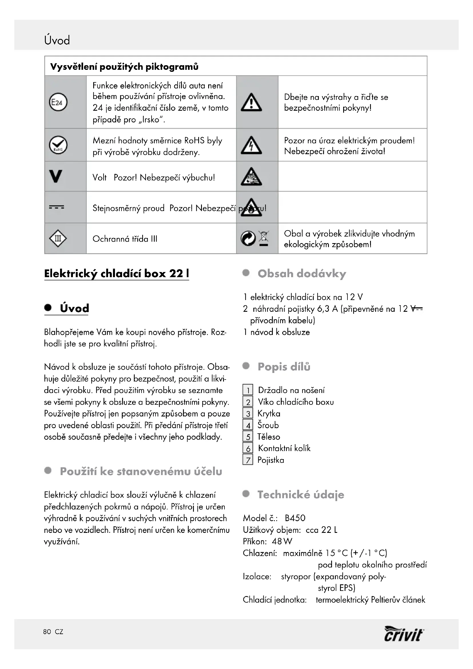 potrošnika, ki izhajajo iz odgovornosti proda- jalca za napake na blagu. Prodajalec: Lidl Slovenija d.o.o. k.d., Pod lipami 1, SI-1218 Komenda79 CZ Seznam obsahu Vysvětlení použitých piktogramů ...........................................................................Strana 80 Úvod .................................................................................................................................................Strana 80 Použití ke stanovenému účelu..........................................................................................................Strana 80 Obsah dodávky ............................................................................................................................... Strana 80 Popis dílů ..........................................................................................................................................Strana 80 Technické údaje ...............................................................................................................................Strana 80 Všeobecná bezpečnostní upozornění ..................................................................Strana 81 Bezpečnost při provozu přístroje ............................................................................Strana 81 Všeobecné pokyny k použití ...........................................................................................................Strana 82 Zafixování víka chladícího boxu držadlem na nošení ...................................................................Strana 83 Tipy pro lepší chladicí výkon a úsporu energie .............................................................................Strana 83 Před uvedením do provozu..........................................................................................Strana 83 Uvedení do provozu ...........................................................................................................Strana 83 Výměna pojistky na 12 V ...............................................................................................Strana 83 Odstranění poruch ...............................................................................................................Strana 83 Čistění a ošetřování .............................................................................................................Strana 84 Odstranění do odpadu .....................................................................................................Strana 84 Záruka a servis ....................................................................................................................... Strana 84 Adresa servisu .................................................................................................................................. Strana 8480 CZ Úvod Vysvětlení použitých piktogramů Funkce elektronických dílů auta není během používání přístroje ovlivněna. 24 je identifikační číslo země, v tomto případě pro „Irsko“. Dbejte na výstrahy a řiďte se bezpečnostními pokyny! Mezní hodnoty směrnice RoHS byly při výrobě výrobku dodrženy. Pozor na úraz elektrickým proudem! Nebezpečí ohrožení života! Volt Pozor! Nebezpečí výbuchu! Stejnosměrný proud Pozor! Nebezpečí požáru! Ochranná třída III Obal a výrobek zlikvidujte vhodným ekologickým způsobem! Elektrický chladící box 22 l Úvod Blahopřejeme Vám ke koupi nového přístroje. Roz- hodli jste se pro kvalitní přístroj. Návod k obsluze je součástí tohoto přístroje. Obsa- huje důležité pokyny pro bezpečnost, použití a likvi- daci výrobku. Před použitím výrobku se seznamte se všemi pokyny kobsluze a bezpečnostními pokyny. Používejte přístroj jen popsaným způsobem a pouze pro uvedené oblasti použití. Při předání přístroje třetí osobě současně předejte i všechny jeho podklady. Použití ke stanovenému účelu Elektrický chladicí box slouží výlučně kchlazení předchlazených pokrmů a nápojů. Přístroj je určen výhradně k používání v suchých vnitřních prostorech nebo ve vozidlech. Přístroj není určen ke komerčnímu využívání. Obsah dodávky 1 elektrický chladící box na 12 V 2 náhradní pojistky 6,3A (připevněné na 12 V přívodním kabelu) 1 návod kobsluze Popis dílů