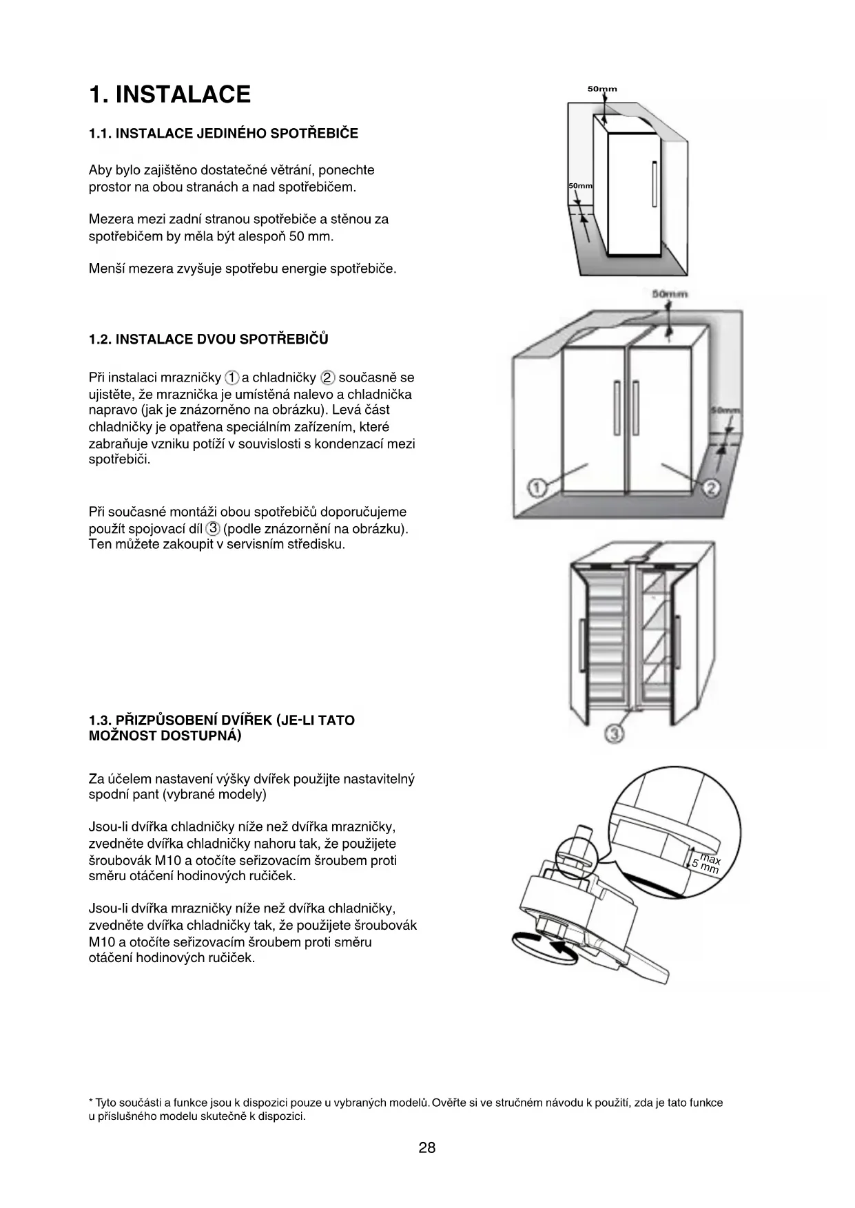 (podleznázorněnínaobrázku). Tenmůžetezakoupitvservisnímstředisku. 1.3. PŘIZPŮSOBENÍ DVÍŘEK (JE-LI TATO MOŽNOST DOSTUPNÁ) Zaúčelemnastavenívýškydvířekpoužijtenastavitelný spodnípant(vybranémodely) Jsou-lidvířkachladničkyníženeždvířkamrazničky, zvednětedvířkachladničkynahorutak,žepoužijete šroubovákM10aotočíteseřizovacímšroubemproti směruotáčeníhodinovýchručiček. Jsou-lidvířkamrazničkyníženeždvířkachladničky, zvednětedvířkachladničkytak,žepoužijetešroubovák M10aotočíteseřizovacímšroubemprotisměru otáčeníhodinovýchručiček. *Tytosoučástiafunkcejsoukdispozicipouzeuvybranýchmodelů.Ověřtesivestručnémnávodukpoužití,zdajetatofunkce upříslušnéhomodeluskutečněkdispozici. 50mm 50mm 5 mm max29