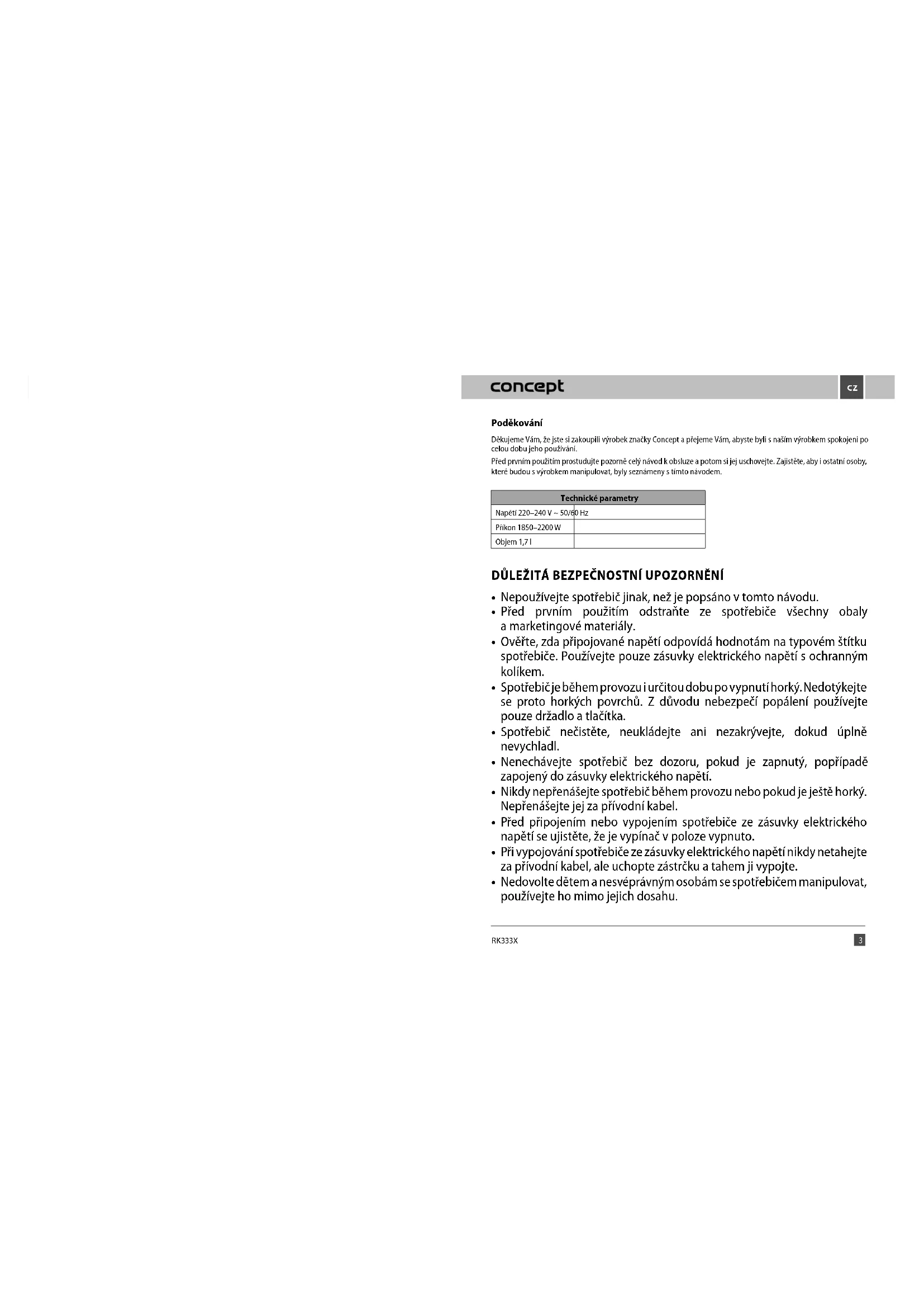 Poděkování Děkujeme Vám, že jste si zakoupili výrobek značky Concept a přejeme Vám, abyste byli s naším výrobkem spokojeni po celou dobu jeho používání. Před prvním použitím prostudujte pozorně celý návod k obsluze a potom si jej uschovejte. Zajistěte, aby i ostatní osoby, které budou s výrobkem manipulovat, byly seznámeny s tímto návodem. Technické parametry Napětí 220–240 V ~ 50/60 Hz Příkon 1850–2200 W Objem 1,7 l DŮLEŽITÁ BEZPEČNOSTNÍ UPOZORNĚNÍ