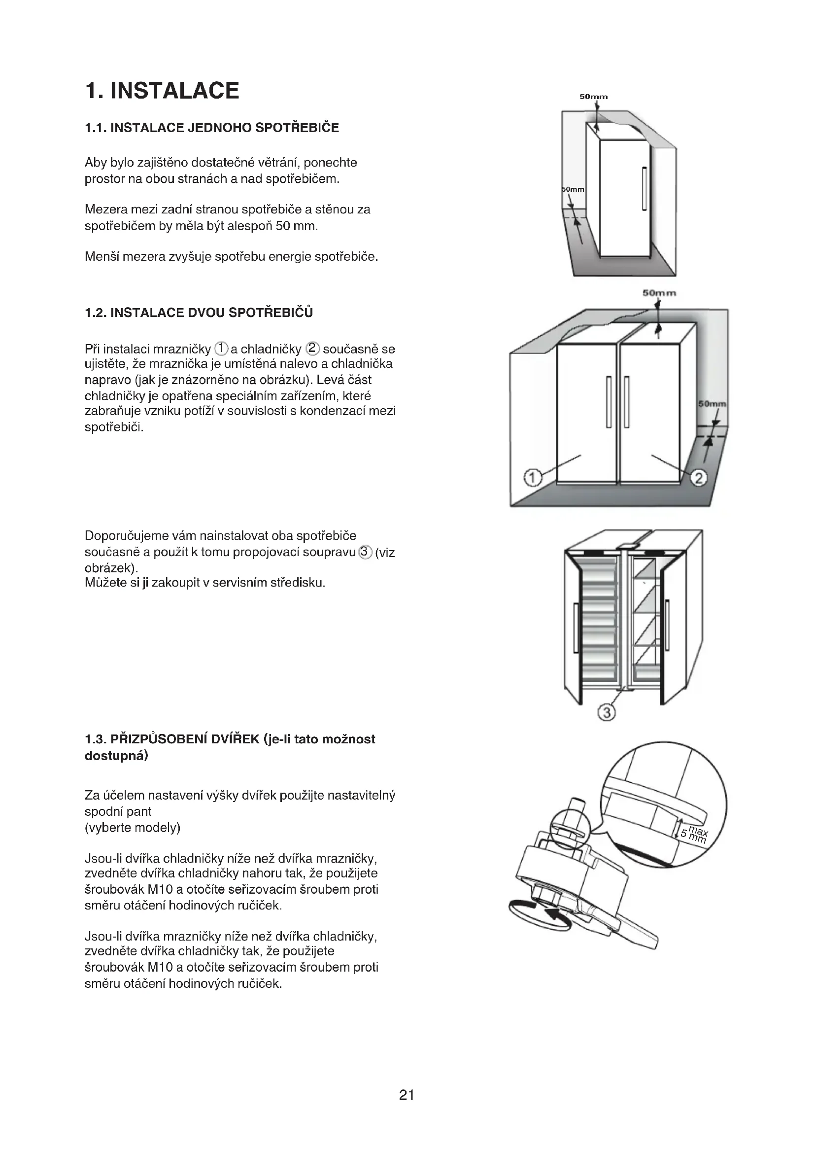 (viz obrázek). Můžetesijizakoupitvservisnímstředisku. 1.3. PŘIZPŮSOBENÍ DVÍŘEK (je-li tato možnost dostupná) Zaúčelemnastavenívýškydvířekpoužijtenastavitelný spodnípant (vybertemodely) Jsou-lidvířkachladničkyníženeždvířkamrazničky, zvednětedvířkachladničkynahorutak,žepoužijete šroubovákM10aotočíteseřizovacímšroubemproti směruotáčeníhodinovýchručiček. Jsou-lidvířkamrazničkyníženeždvířkachladničky, zvednětedvířkachladničkytak,žepoužijete šroubovákM10aotočíteseřizovacímšroubemproti směruotáčeníhodinovýchručiček. 50mm 50mm 5 mm max22