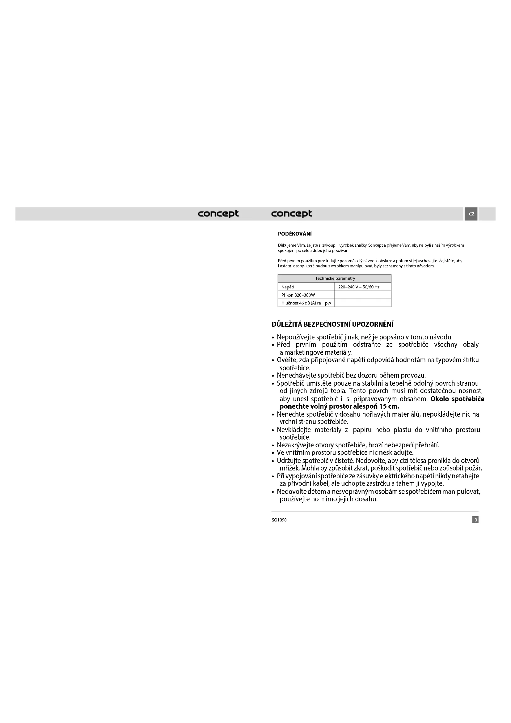 Děkujeme Vám, že jste si zakoupili výrobek značky Concept a přejeme Vám, abyste byli s naším výrobkem spokojeni po celou dobu jeho používání. Před prvním použitím prostudujte pozorně celý návod k obsluze a potom si jej uschovejte. Zajistěte, aby i ostatní osoby, které budou s výrobkem manipulovat, byly seznámeny s tímto návodem. Technické parametry Napětí 220–240 V ~ 50/60 Hz Příkon 245 W Hlučnost 46 dB (A) re 1 pw DŮLEŽITÁ BEZPEČNOSTNÍ UPOZORNĚNÍ: