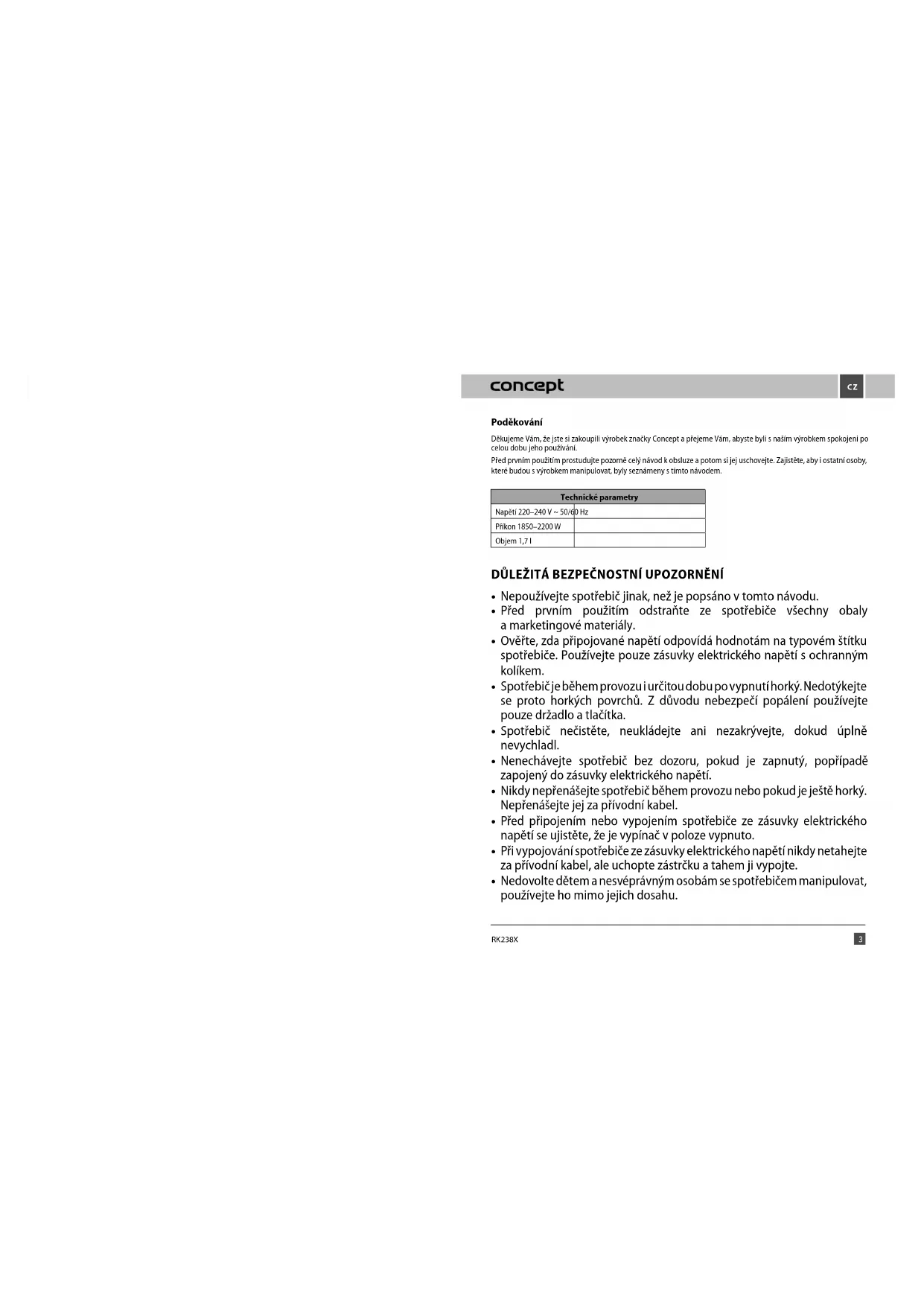 Poděkování Děkujeme Vám, že jste si zakoupili výrobek značky Concept a přejeme Vám, abyste byli s naším výrobkem spokojeni po celou dobu jeho používání. Před prvním použitím prostudujte pozorně celý návod k obsluze a potom si jej uschovejte. Zajistěte, aby i ostatní osoby, které budou s výrobkem manipulovat, byly seznámeny s tímto návodem. Technické parametry Napětí 220–240 V ~ 50/60 Hz Příkon 1850–2200 W Objem 1,7 l DŮLEŽITÁ BEZPEČNOSTNÍ UPOZORNĚNÍ