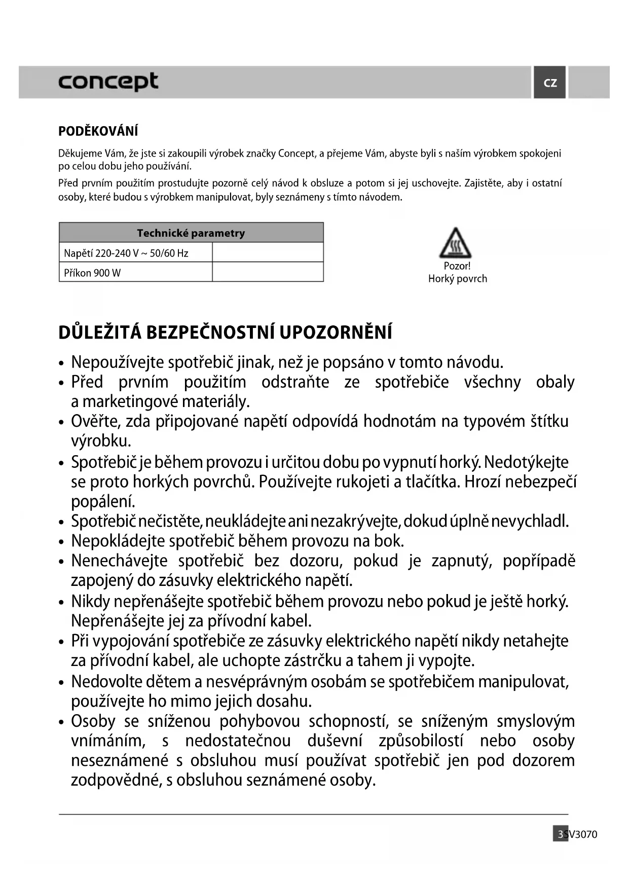 Děkujeme Vám, že jste si zakoupili výrobek značky Concept, a přejeme Vám, abyste byli s naším výrobkem spokojeni po celou dobu jeho používání. Před prvním použitím prostudujte pozorně celý návod k obsluze a potom si jej uschovejte. Zajistěte, aby i ostatní osoby, které budou s výrobkem manipulovat, byly seznámeny s tímto návodem. Technické parametry Napětí 220-240 V ~ 50/60 Hz Příkon 900 W DŮLEŽITÁ BEZPEČNOSTNÍ UPOZORNĚNÍ