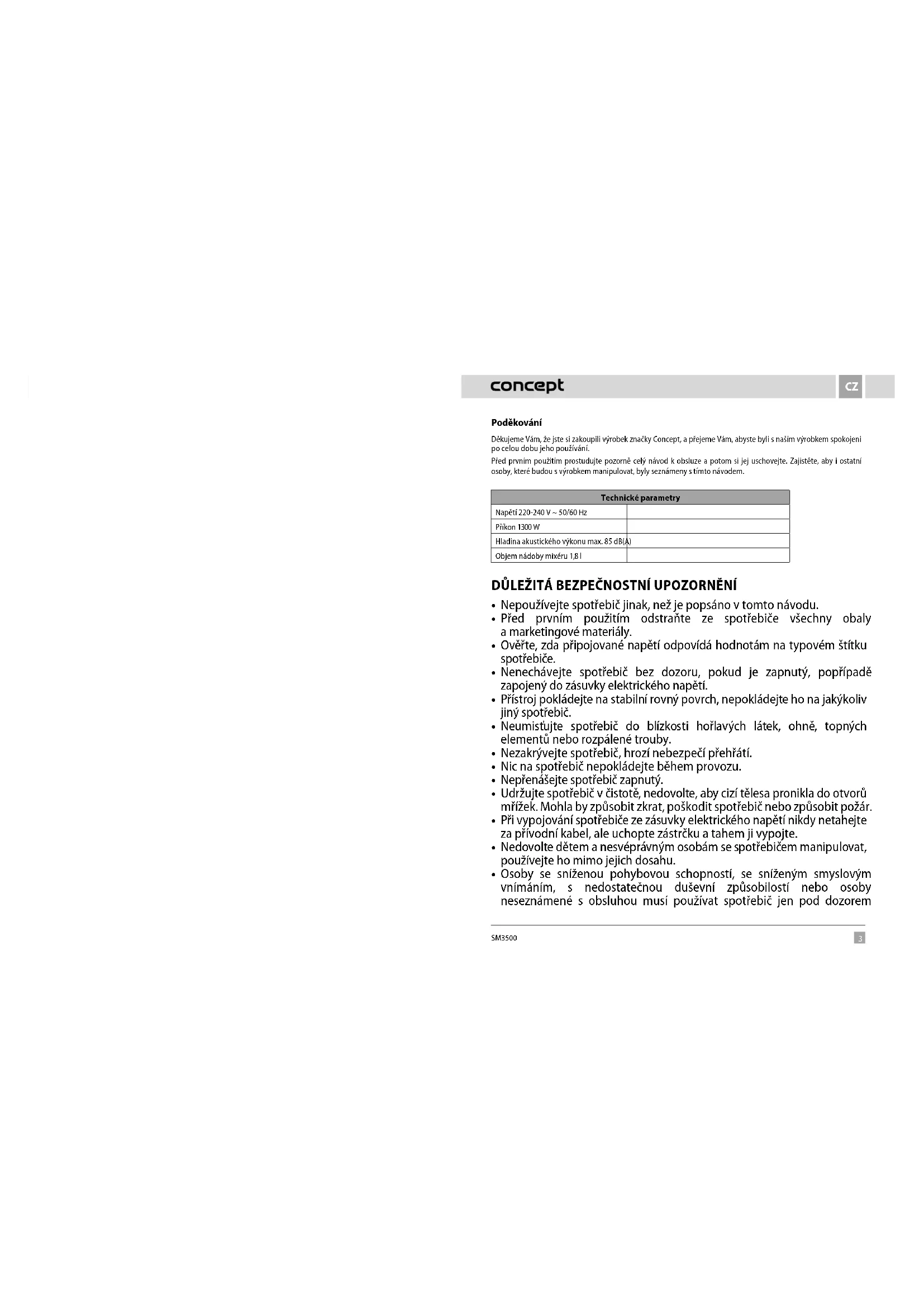 Poděkování Děkujeme Vám, že jste si zakoupili výrobek značky Concept, a přejeme Vám, abyste byli s naším výrobkem spokojeni po celou dobu jeho používání. Před prvním použitím prostudujte pozorně celý návod k obsluze a potom si jej uschovejte. Zajistěte, aby i ostatní osoby, které budou s výrobkem manipulovat, byly seznámeny s tímto návodem. Technické parametry Napětí 220-240 V ~ 50/60 Hz Příkon 1300 W Hladina akustického výkonu max. 85 dB(A) Objem nádoby mixéru 1,8 l DŮLEŽITÁ BEZPEČNOSTNÍ UPOZORNĚNÍ