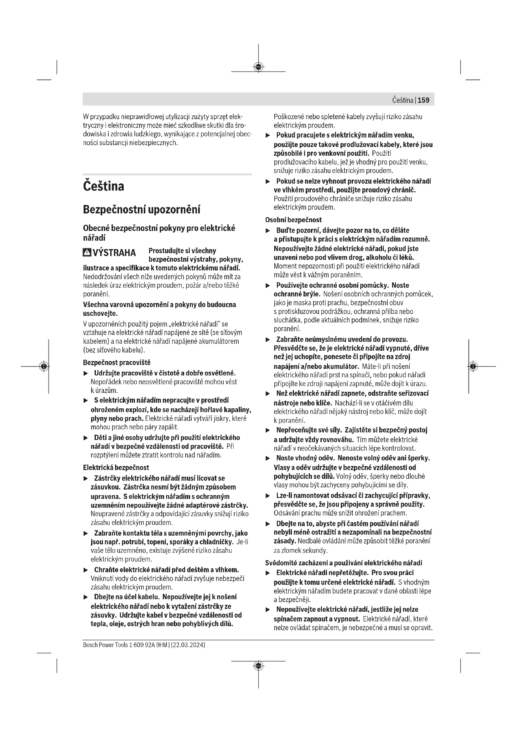 Aby wyłączyć elektronarzędzie, należy zwolnić włącznik/ wyłącznik(2). u Narzędzia szlifierskie należy kontrolować przed każ- dym użyciem. Narzędzie szlifierskie musi być prawi- dłowo zamocowane i musi się swobodnie obracać. Na- leży przeprowadzić próbę działania trwającą co naj- mniej jedną minutę (bez obciążenia). Nie wolno uży- wać uszkodzonych, odkształconych bądź wibrujących narzędzi szlifierskich. Uszkodzone narzędzia szlifierskie mogą się złamać i spowodować poważne obrażenia. Konserwacja i serwis Konserwacja i czyszczenie u Przed przystąpieniem do jakichkolwiek prac przy elektronarzędziu należy wyjąć wtyczkę z gniazda. u Utrzymywanie urządzenia i szczelin wentylacyjnych w czystości gwarantuje prawidłową i bezpieczną pracę. u W ekstremalnych warunkach pracy należy w miarę możliwości zawsze korzystać z systemu odsysania py- łu. Należy też często przedmuchiwać otwory wentyla- cyjne i stosować wyłącznik ochronny różnicowoprądo- wy. Podczas obróbki metali może dojść do osadzenia się wewnątrz elektronarzędzia pyłu metalicznego, mogącego przewodzić prąd. Może to mieć niekorzystny wpływ na izolację ochronną elektronarzędzia. Należy obchodzić się pieczołowicie z osprzętem podczas przechowywania i podczas pracy. Jeżeli konieczna okaże się wymiana przewodu przyłączenio- wego, należy zlecić ją firmie Bosch lub autoryzowanemu ser- wisowi elektronarzędzi Bosch, co pozwoli uniknąć ryzyka za- grożenia bezpieczeństwa. Obsługa klienta oraz doradztwo dotyczące użytkowania Ze wszystkimi pytaniami, dotyczącymi naprawy ikonserwa- cji nabytego produktu oraz dostępu do części zamiennych, prosimy zwracać się do punktów obsługi klienta. Rysunki techniczne oraz informacje o częściach zamiennych można znaleźć pod adresem: www.bosch-pt.com Nasz zespół doradztwa dotyczącego użytkowania odpowie na wszystkie pytania związane z produktami firmy Bosch oraz ich osprzętem. Przy wszystkich zgłoszeniach oraz zamówieniach części za- miennych konieczne jest podanie 10‑cyfrowego numeru ka- talogowego, znajdującego się na tabliczce znamionowej pro- duktu. Polska Robert Bosch Sp. z o.o. Serwis Elektronarzędzi Ul. Jutrzenki 102/104 02-230 Warszawa Na www.serwisbosch.com znajdą Państwo wszystkie szcze- góły dotyczące usług serwisowych online. Tel.: 22 7154450 Faks: 22 7154440 E-Mail: bsc@pl.bosch.com www.bosch-pt.pl Pozostałe adresy serwisów znajdują się na stronie: www.bosch-pt.com/serviceaddresses Utylizacja odpadów Elektronarzędzia, osprzęt i opakowanie należy doprowadzić do powtórnego przetworzenia zgodnie z obowiązującymi przepisami ochrony środowiska. Nie wolno wyrzucać elektronarzędzi razem z odpadami z gospodarstwa domowego! Tylko dla krajów UE: Zgodnie z dyrektywą Parlamentu Europejskiego i Rady 2012/19/UE w sprawie zużytego sprzętu elektrycznego i elektronicznego oraz jej transpozycją do prawa krajowego, niezdatne do użytku elektronarzędzia należy zbierać osobno i doprowadzić do recyklingu zgodnie z obowiązującymi prze- pisami ochrony środowiska. 1 609 92A 9HM | (22.03.2024) Bosch Power ToolsČeština | 159 W przypadku nieprawidłowej utylizacji zużyty sprzęt elek- tryczny i elektroniczny może mieć szkodliwe skutki dla śro- dowiska i zdrowia ludzkiego, wynikające z potencjalnej obec- ności substancji niebezpiecznych. Čeština Bezpečnostní upozornění Obecné bezpečnostní pokyny pro elektrické nářadí VÝSTRAHA Prostudujte si všechny bezpečnostní výstrahy, pokyny, ilustrace aspecifikace ktomuto elektrickému nářadí. Nedodržování všech níže uvedených pokynů může mít za následek úraz elektrickým proudem, požár a/nebo těžké poranění. Všechna varovná upozornění apokyny do budoucna uschovejte. Vupozorněních použitý pojem „elektrické nářadí“ se vztahuje na elektrické nářadí napájené ze sítě (se síťovým kabelem) ana elektrické nářadí napájené akumulátorem (bez síťového kabelu). Bezpečnost pracoviště u Udržujte pracoviště včistotě adobře osvětlené. Nepořádek nebo neosvětlené pracoviště mohou vést kúrazům. u Selektrickým nářadím nepracujte vprostředí ohroženém explozí, kde se nacházejí hořlavé kapaliny, plyny nebo prach. Elektrické nářadí vytváří jiskry, které mohou prach nebo páry zapálit. u Děti ajiné osoby udržujte při použití elektrického nářadí vbezpečné vzdálenosti od pracoviště. Při rozptýlení můžete ztratit kontrolu nad nářadím. Elektrická bezpečnost u Zástrčky elektrického nářadí musí lícovat se zásuvkou. Zástrčka nesmí být žádným způsobem upravena. Selektrickým nářadím sochranným uzemněním nepoužívejte žádné adaptérové zástrčky. Neupravené zástrčky aodpovídající zásuvky snižují riziko zásahu elektrickým proudem. u Zabraňte kontaktu těla suzemněnými povrchy, jako jsou např. potrubí, topení, sporáky achladničky. Je‑li vaše tělo uzemněno, existuje zvýšené riziko zásahu elektrickým proudem. u Chraňte elektrické nářadí před deštěm avlhkem. Vniknutí vody do elektrického nářadí zvyšuje nebezpečí zásahu elektrickým proudem. u Dbejte na účel kabelu. Nepoužívejte jej knošení elektrického nářadí nebo kvytažení zástrčky ze zásuvky. Udržujte kabel vbezpečné vzdálenosti od tepla, oleje, ostrých hran nebo pohyblivých dílů. Poškozené nebo spletené kabely zvyšují riziko zásahu elektrickým proudem. u Pokud pracujete selektrickým nářadím venku, použijte pouze takové prodlužovací kabely, které jsou způsobilé ipro venkovní použití. Použití prodlužovacího kabelu, jež je vhodný pro použití venku, snižuje riziko zásahu elektrickým proudem. u Pokud se nelze vyhnout provozu elektrického nářadí ve vlhkém prostředí, použijte proudový chránič. Použití proudového chrániče snižu