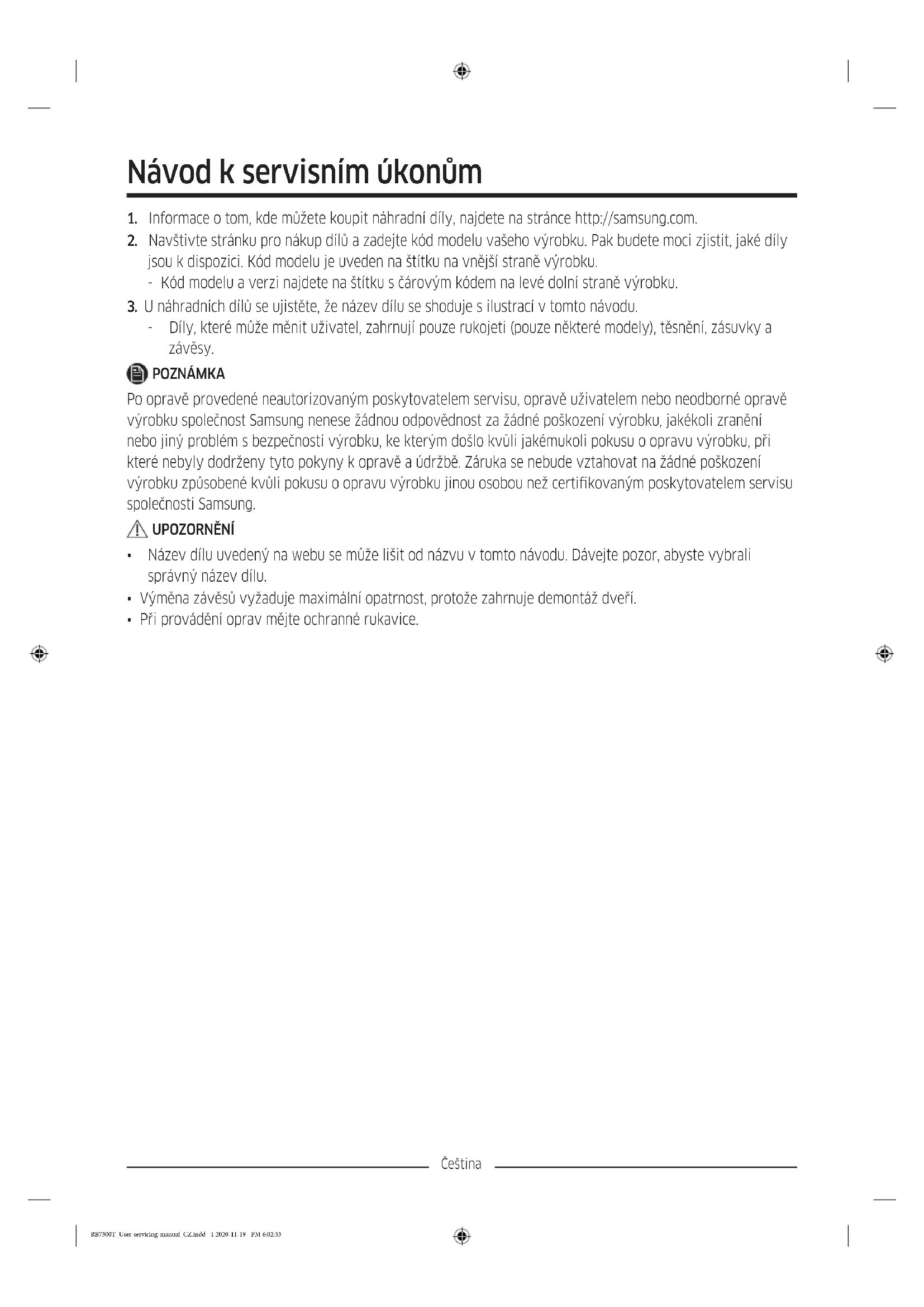 - Při provádění oprav mějte ochranné rukavice. RB7300T_User-servicing-manual_CZ.indd 1 2020-11-19 PM 6:02:33Čeština Skutečný vzhled a součásti chladničky se mohou od obrázku v závislosti na modelu a zemi, ve které se nacházíte, lišit.