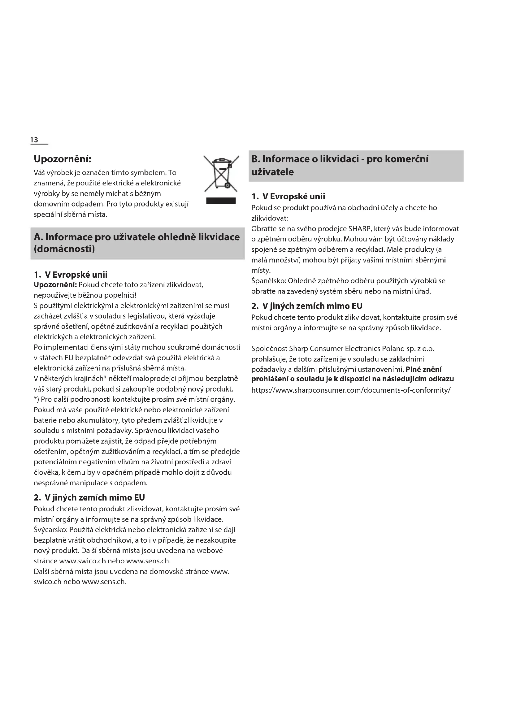 Pokud se produkt používá na obchodní účely a chcete ho zlikvidovat: Obraťte se na svého prodejce SHARP, který vás bude informovat o zpětném odběru výrobku. Mohou vám být účtovány náklady spojené se zpětným odběrem a recyklací. Malé produkty (a malá množství) mohou být přijaty vašimi místními sběrnými místy. Španělsko: Ohledně zpětného odběru použitých výrobků se obraťte na zavedený systém sběru nebo na místní úřad.