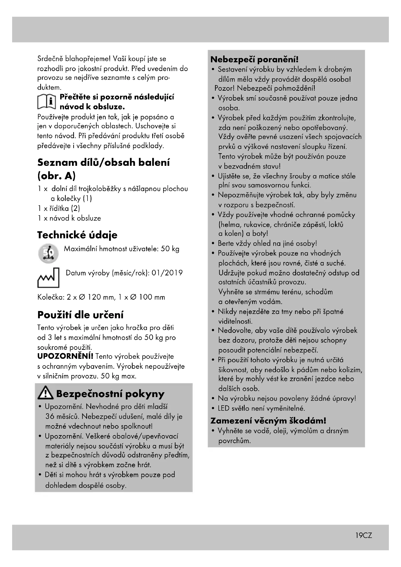 šrouby. Po výměně: Ujistěte se, že jsou šrouby po prvních minutách jízdy ještě utažené a že se neuvolnily nebo nepovolily. Kolečko ještě jednou utáhněte, abyste zajistili, že poběží klidně. Uskladnění, čištění Po použití doporučujeme výrobek důkladně vyčistit a vysušit. Odstraňte malé kamínky nebo jiné předměty, které eventuálně uvízly na kolečkách. Výrobek vždy uchovávejte na suchém místě. Pokyny k likvidaci Výrobek a balící materiál zlikvidujte dle aktuálních místních předpisů. Balící materiály jako např. fóliové pytle nepatří do rukou dětí. Uchovávejte balící materiál mimo dosah dětí. Výrobek a obal zlikvidujte ekologicky. Recyklační kód identifikuje různé materiály pro recyklaci. Kód se skládá z recyklačního symbolu – který indikuje recyklační cyklus – a čísla identifikujícího materiál. Přístroje označené uvedeným symbolem nesmějí být likvidovány v běžném domácím odpadu. Tyto staré elektronic- ké a elektrické přístroje je třeba zlikvidovat odděleně. Informujte se prosím u obce o mož- nostech řízené likvidace. CZ21CZ Pokyny k záruce a průběhu služby Produkt byl vyrobený s velkou pečlivostí a byl průběžně kontrolovaný ve výrobní procesu. Na tento produkt obdržíte tříroční záruku ode dne zakoupení. Uschovejte si pokladní stvrzenku. Záruka se vztahuje jen na vady materiálu a chyby z výroby, nevztahuje se na závady způsobené neodborným zacházením nebo použitím k jinému účelu. Tato záruka neomezuje Vaše zákonná ani záruční práva. Při případných reklamacích se obraťte na dole uvedenou servisní horkou linku nebo nám zašlete email. Náš servisní pracovník s Vámi co nejrychleji upřesní další postup. V každém případě Vám osobně poradíme. Záruční doba se neprodlužuje po případných opravách v době záruky ani v případě zákon- ného ručení nebo kulance. Toto platí také pro náhradní a opravené díly. Opravy prováděné po vypršení záruční lhůty se platí. IAN: 312058 Servis Česko Tel.: 800143873 E-Mail: deltasport@lidl.cz22 SK Srdečne Vám blahoželáme! Vašou kúpou ste sa rozhodli pre vysokokvalitný produkt. Skôr než začnete produkt používať, dôkladne sa s ním oboznámte. K tomu si prečítajte tento návod na obsluhu. Produkt používajte v súlade s pokynmi uvedený- mi v návode a na účely, na ktoré je produkt určený. Tento návod si odložte. Ak produkt odovzdáte tretej osobe, priložte jej tiež všetky podklady. Popis dielov/Rozsah dodávky (obr. A) 1 x spodný diel trojkolesovej kolobežky s nášľapnou doskou a kolieskami (1) 1 x tyč kormidla (2) 1 x návod na obsluhu Technické údaje Maximálna hmotnosť používateľa: 50 kg Dátum výroby (mesiac/rok): 01/2019 Kolieska: 2 x Ø 120 mm, 1 x Ø 100 mm Určené použitie Tento výrobok je hračka pre deti od 3 rokov s maximálnou hmotnosťou používateľa do 50 kg na súkromné použitie. UPOZORNENIE! Používať s ochrannými pomôckami. Nepoužívať v cestnej prevádzke. 50 kg max. Bezpečnostné pokyny