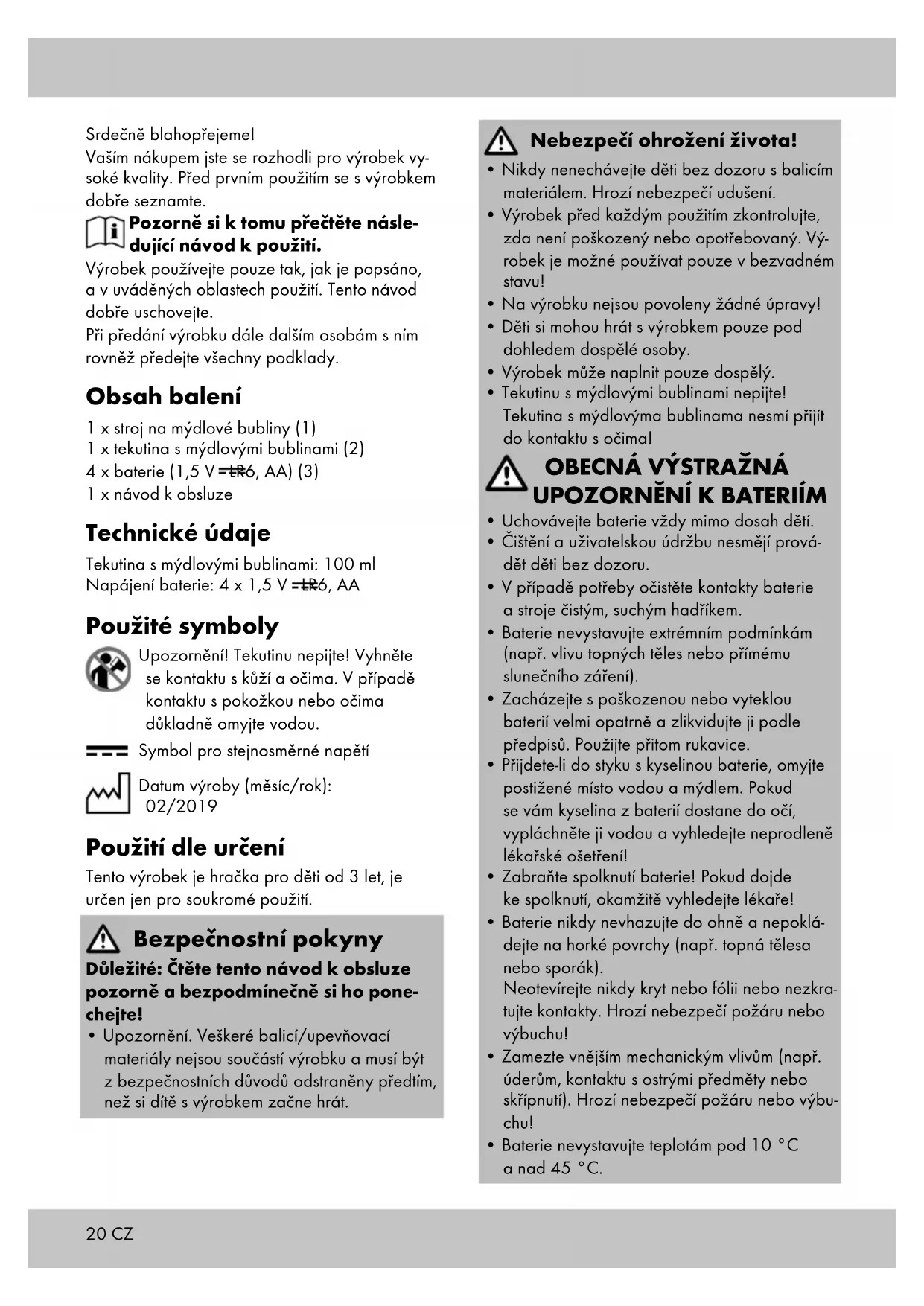 pohyb mýdlového kola (1f). Uskladnění, čištění Výrobek vždy uchovávejte na suchém a čistém místě s konstantní teplotou. Čistěte pouze vlhkým hadříkem. DŮLEŽITÉ! K čištění nikdy nepoužívejte agresivní čisticí prostředky. Pokyny pro likvidaci Výrobek a obalové materiály likvidujte podle aktuálních místních předpisů. Obalové materiály, jako např. fóliové sáčky, nepatří do rukou dětem. Proto uchovávejte obalový materiál z dosahu dětí. Zlikvidujte produkty a balení ekologicky. Recyklační kód identifikuje různé materiály pro recyklaci. Kód se skládá z recyklačního symbolu - který indikuje recyklační cyklus - a čísla identifikujícího materiál. Přístroje označené vedle stojícím symbolem, nesmí být likvidovány s domácím odpadem. Vaší povinností je takové staré elektrické a elektronické přístroje likvidovat zvlášť. Informujte se prosím na Vaší obci o možnostech řádné likvidace odpadu. Před likvidací do odpadu odstraňte z výrobku baterie. Likvidace baterií Respektujte prosím: že v případě baterií se jedná o zvláštní odpad, který se podle zákona nesmí likvidovat s domovním odpadem. Vysloužilé baterie můžete bezplatně odevzdat na sběrných místech komunálního od- padu nebo u obchodníka. Jsou zde k dispozici sběrné nádoby. CZ22 CZ Pokyny k záruce a průběhu služby Produkt byl vyrobený s velkou pečlivostí a byl průběžně kontrolovaný ve výrobní procesu. Na tento produkt obdržíte tříroční záruku ode dne zakoupení. Uschovejte si pokladní stvrzen- ku. Záruka se vztahuje jen na vady materiálu a chyby z výroby, nevztahuje se na závady způsobené neodborným zacházením nebo použitím k jinému účelu. Tato záruka neomezuje Vaše zákonná ani záruční práva. Při případných reklamacích se obraťte na dole uvedenou servisní horkou linku nebo nám zašlete email. Náš servisní pracovník s Vámi co nejrychleji upřesní další postup. V každém případě Vám osobně poradíme. Záruční doba se neprodlužuje po případných opravách v době záruky ani v případě zákon- ného ručení nebo kulance. Toto platí také pro náhradní a opravené díly. Opravy prováděné po vypršení záruční lhůty se platí. IAN: 313534 Servis Česko Tel.: 800143873 E-Mail: deltasport@lidl.cz23SK Srdečne blahoželáme! Svojou kúpou ste sa rozhodli pre kvalitný výrobok. Pred prvým použitím sa oboznámte s výrobkom. Za týmto účelom si pozorne prečítajte nasledovný návod na použitie. Výrobok používajte len tak, ako je popísané a pre uvedené oblasti použitia. Tento návod na použitie si dobre uschovajte. Ak odovzdáte výrobok tretím osobám, odo- vzdajte im aj všetky podklady. Rozsah dodávky 1 x stroj na mydlové bubliny (1) 1 x tekutina na mydlové bubliny (2) 4 x batéria (1,5 V LR6, AA) (3) 1 x návod na obsluhu Technické údaje Tekutina na mydlové bubliny: 100 ml Prevádzka na batérie: 4 x 1,5 V LR6, AA Použité symboly Upozornenie! Nepite tekutinu! Za- bráňte kontaktu s pokožkou a očami. Pri kontakte s pokožkou alebo očami dôkladne umyť vodou. Symbol pre jednosmerné napätie Dátum výroby (mesiac/rok): 02/2019 Určené použitie Tento výrobok je hračka pre deti od 3 rokov, určená na súkromné použitie. Bezpečnostné pokyny Dôležité: Tento návod na obsluhu si starostlivo prečítajte a bezpodmienečne ho uschovajte!