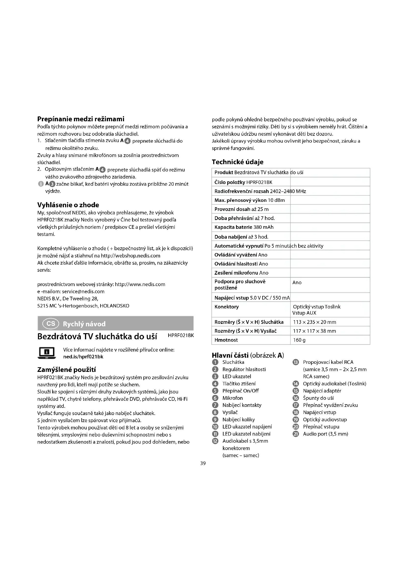 se rozsvítí červeně. Otočením regulátoru hlasitosti A upravte hlasitost na požadovanou úroveň. Otočením přepínače vyvážení zvuku A upravte vyvážení hlasitosti mezi levým a pravým sluchátkem. Přepínání mezi režimy Chcete-li přepnout mezi režimem poslechu arežimem konverzace, aniž byste sluchátka sundali, řiďte se těmito pokyny.1. Stiskem tlačítka ztišení A přepněte do režimu okolního zvuku.Zvuky ahlasy zachycené mikrofonem jsou ve sluchátkách zesíleny.2. Dalším stiskem A přepněte zpět na zvukové zdrojové zařízení. Když výrobku zbývá cca 20minut výdrže baterie, A začne blikat. Prohlášení o shodě My, společnost NEDIS, jako výrobce prohlašujeme, že produkt HPRF021BK od značky Nedis, který byl vyroben v Číně, byl testován podle všech standardů a omezení CE a všechny testy splnil.Úplné prohlášení o shodě (+ bezpečnostní listy, jsou-li použitelné) je možné najít a stáhnout prostřednictvím webu http://webshop.nedis.comChcete-li získat informace o shodě, kontaktujte naše oddělení služeb zákazníkům:Webové stránky: http://www.nedis.comE-mail: service@nedis.comNEDIS B.V., De Tweeling 28,5215 MC ’s-Hertogenbosch, NIZOZEMSKO42