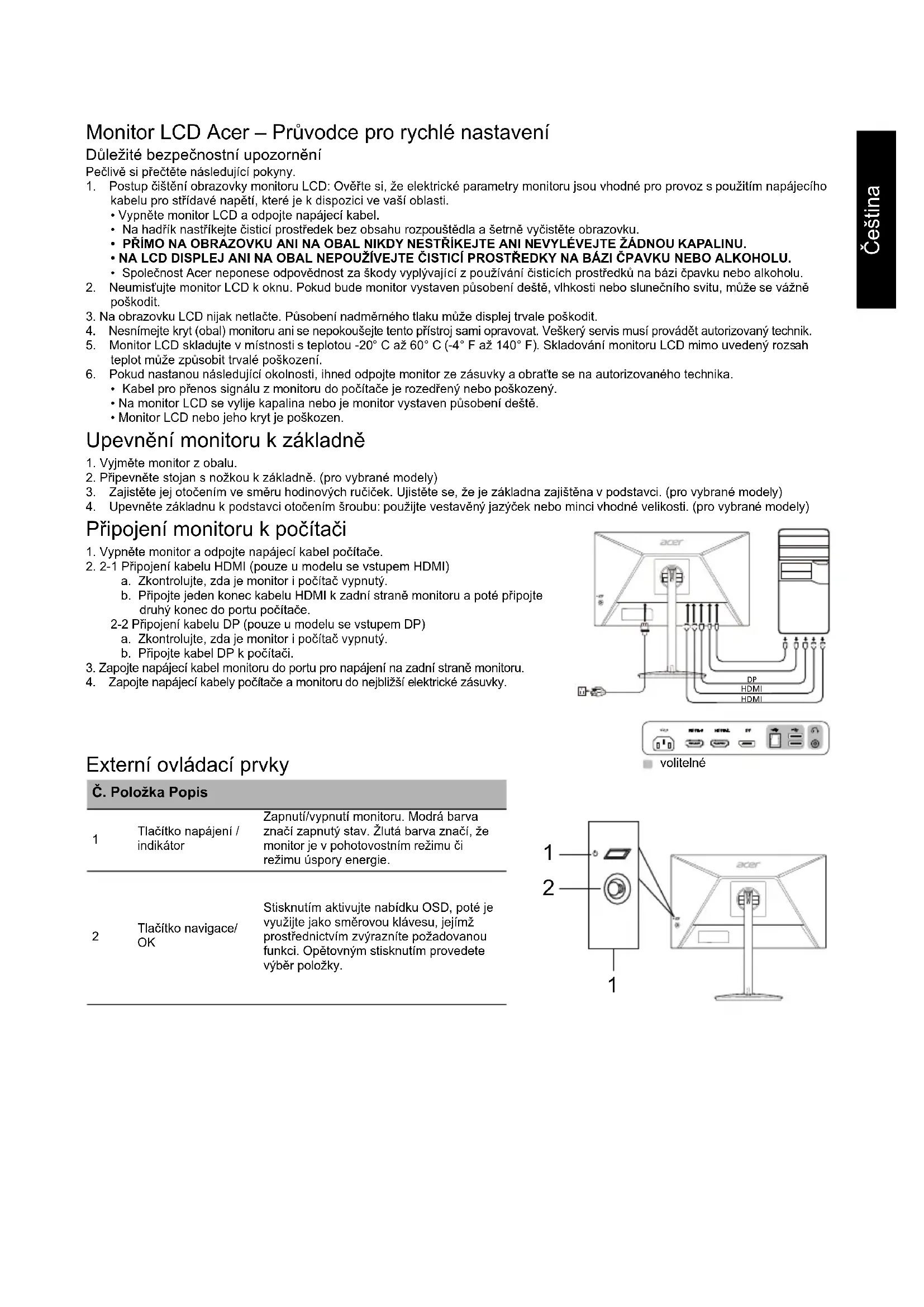 仕様は モ デルや地域に よ り 異な り ま す。Čeština Monitor LCD Acer – Průvodce pro rychlé nastavení Důležité bezpečnostní upozornění Pečlivě si přečtěte následující pokyny. 1. Postup čištění obrazovky monitoru LCD: Ověřte si, že elektrické parametry monitoru jsou vhodné pro provoz s použitím napájecího kabelu pro střídavé napětí, které je k dispozici ve vaší oblasti.• Vypněte monitor LCD a odpojte napájecí kabel.