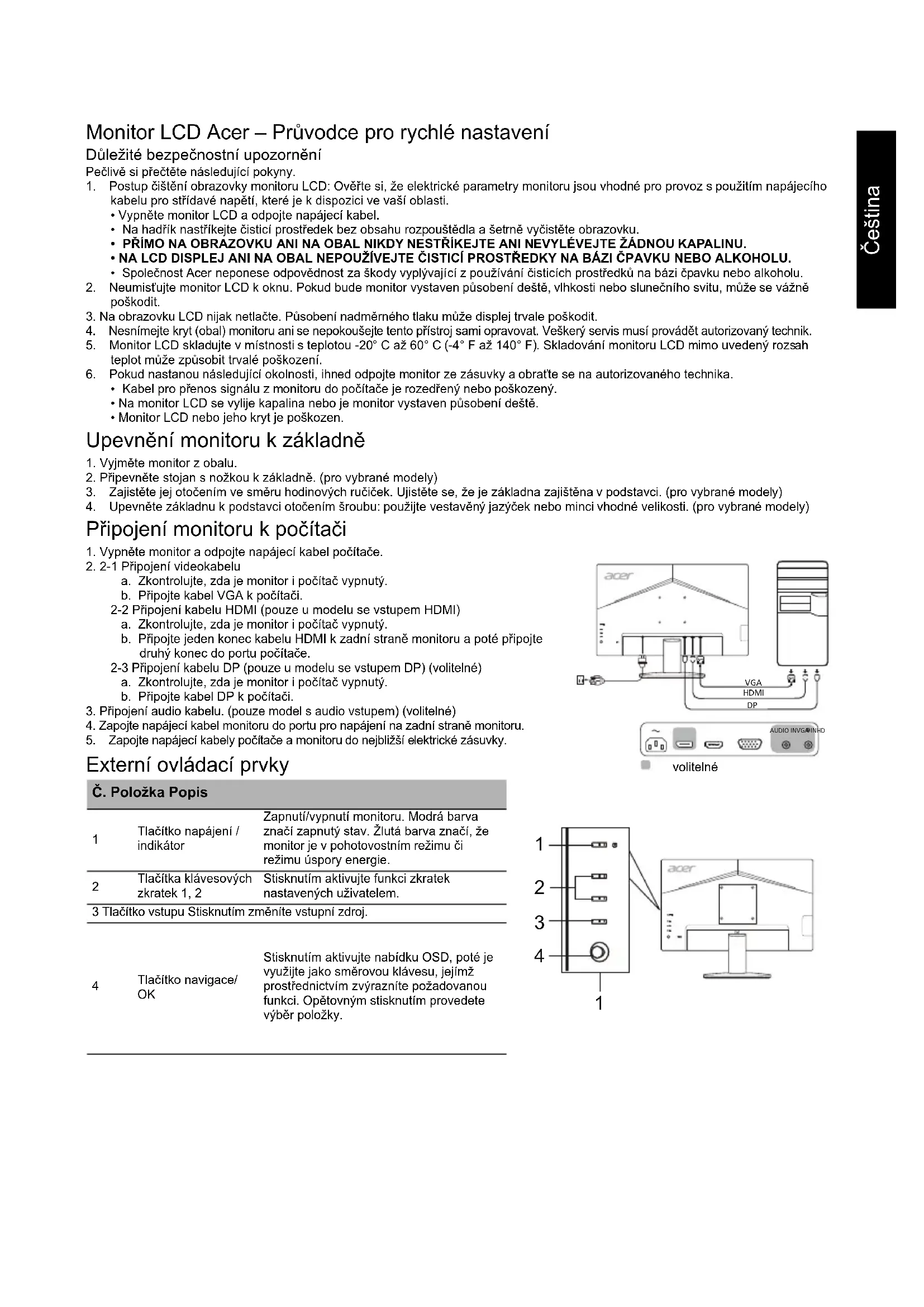 仕様は モ デルや地域に よ り 異な り ま す。Čeština Monitor LCD Acer – Průvodce pro rychlé nastavení Důležité bezpečnostní upozornění Pečlivě si přečtěte následující pokyny. 1. Postup čištění obrazovky monitoru LCD: Ověřte si, že elektrické parametry monitoru jsou vhodné pro provoz s použitím napájecího kabelu pro střídavé napětí, které je k dispozici ve vaší oblasti.• Vypněte monitor LCD a odpojte napájecí kabel.
