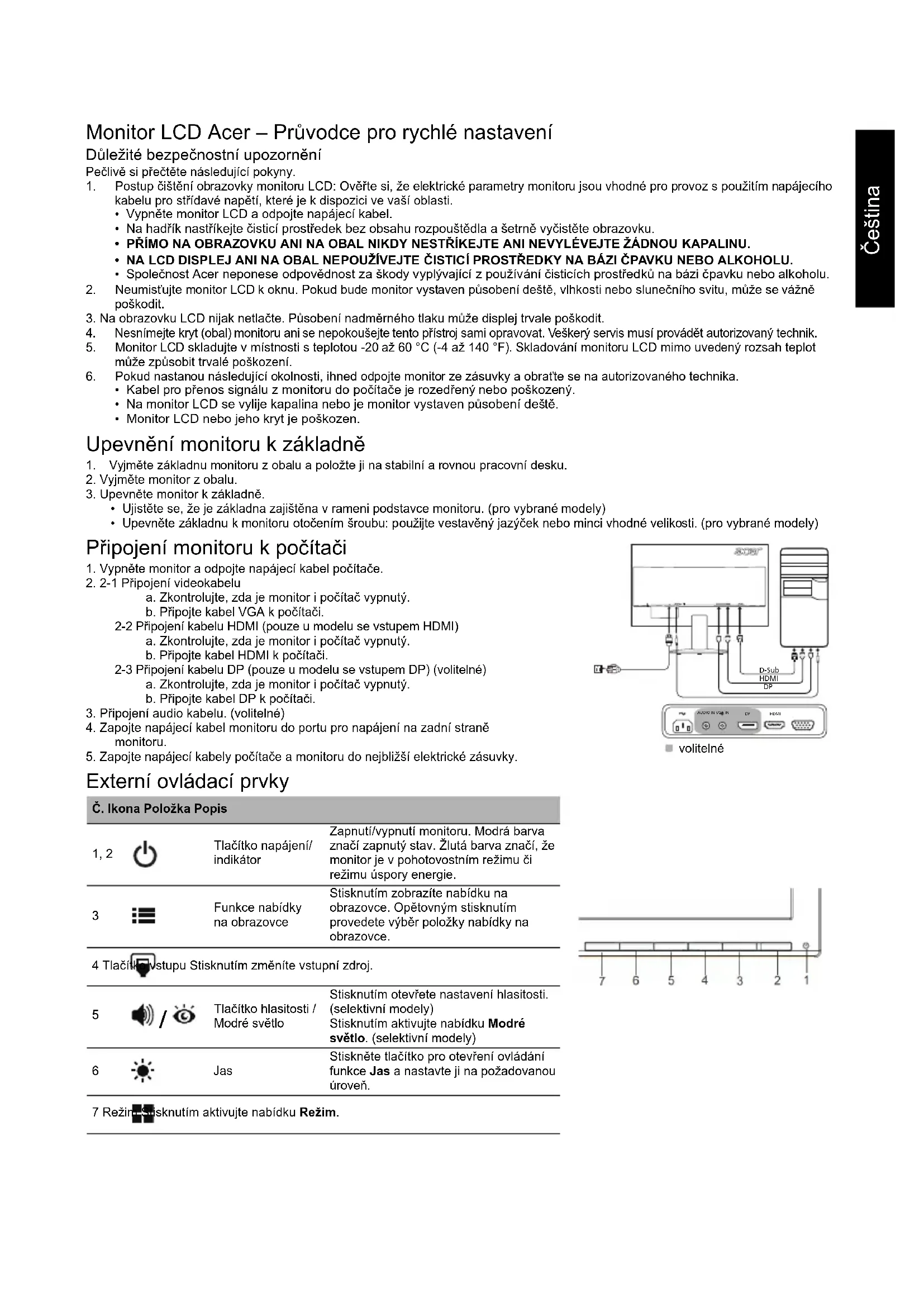 volitelnéČeština Předpisy a bezpečnostní upozornění Upozornění FCC (Federálního výboru pro telekomunikace) Toto zařízení bylo testováno a splňuje limity pro třídu B digitálních zařízení, podle oddílu 15 Pravidel FCC. Tyto limity zabezpečují odpovídající ochranu proti škodlivému rušení při instalaci v domácnosti. Toto zařízení generuje, používá a může vyzařovat vysokofrekvenční energii, a pokud není instalováno a používáno v souladu s instrukcemi, může způsobit škodlivé rušení rádiové komunikace. Nelze však zaručit, že se rušení v určité instalaci neobjeví. Jestliže toto zařízení způsobí škodlivé rušení rádiového nebo televizního příjmu, které lze zjistit vypnutím nebo zapnutím zařízení, je uživateli doporučeno pokusit se rušení potlačit jedním z následujících opatření: Přesměrujte nebo přemístěte přijímací anténu. Zvětšete odstup mezi zařízením a přijímačem. Připojte zařízení k jinému výstupu okruhu, než ke kterému je nyní připojen. Poraďte se s distributorem nebo zkušeným technikem specializovaným na obor rádio a televizory. Prohlášení o shodě CE Společnost Acer Inc. tímto prohlašuje, že tento monitor LCD je v souladu se základními požadavky a dalšími platnými ustanoveními směrnice EMC 2014/30/EU, 2014/35/EU (směrnice týkající se nízkého napětí), směrnice RoHS 2011/65/EU a směrnice 2009/125/EC, týkající se rámců pro stanovení požadavků na ekologickou konstrukci pro produkty využívající energii. Upozornění: Nezvedejte monitor za základnu, aby nedošlo k poškození monitoru. Upozornění: Stíněné kabely Veškerá připojení k jiným zařízením výpočetní techniky je nutno provádět s využitím stíněných kabelů, aby byla zajištěna shoda s předpisy pro elektromagnetickou kompatibilitu (EMC). Upozornění: Periferní zařízení K tomuto zařízení smějí být připojena pouze periferní zařízení (zařízení pro vstup a výstup signálu, terminály, tiskárny apod.) certifikovaná ohledně shody s limity pro třídu B. Provoz necertifikovaných periferních zařízení pravděpodobně způsobí rušení příjmu rádia a televize. Varování Změny nebo úpravy, které nejsou výslovně schváleny výrobcem, by mohly anulovat oprávnění uživatele používat tento produkt (oprávnění garantuje Federální výbor pro telekomunikace). Provozní podmínky Toto zařízení vyhovuje požadavkům FCC, oddíl 15. Užívání zařízení podléhá těmto dvěma podmínkám: (1) toto zařízení nesmí být zdrojem škodlivého rušení a (2) toto zařízení musí akceptovat jakékoli přijímané rušení, včetně rušení, které může být příčinou nežádoucího provozu. Upozornění: Uživatelé v Kanadě Tento digitální přístroj třídy B vyhovuje kanadskému standardu ICES-003. Remarque à l'intention des utilisateurs canadiens Cet appareil numérique de la classe B est conforme à la norme NMB-003 du Canada. Likvidace vyřazených zařízení uživateli v soukromých domácnostech v Evropské unii Tento symbol na produktu nebo jeho obalu znamená, že produkt nesmí být likvidován s běžným domácím odpadem. Namísto toho přejímáte odpovědnost za likvidaci zařízení tak, že je odevzdáte na určeném sběrném místě pro recyklaci vyřazených elektrických a elektronických zařízení. Třídění a recyklace vyřazených zařízení přispívá k ochraně přírodních zdrojů a zajistí recyklaci zařízení způsobem, jenž ochrání zdraví osob i životního prostředí. Další informace o tom, kde můžete své vyřazené zařízení předat k recyklaci, vám poskytne místní obecní úřad, komunální služby nebo obchod, kde jste produkt zakoupili.Čeština TECHNICKÉ ÚDAJE Návody a další dokumenty pro svůj produkt Acer naleznete na oficiálních webových stránkách podpory společnosti Acer. Panel LCD Provozní systém Barevný LCD TFT Velikost 21,5”W (55 cm) Rozteč pixelů 0,248 mm (horizontálně) × 0,248 mm (vertikálně) Jas 250 cd/m