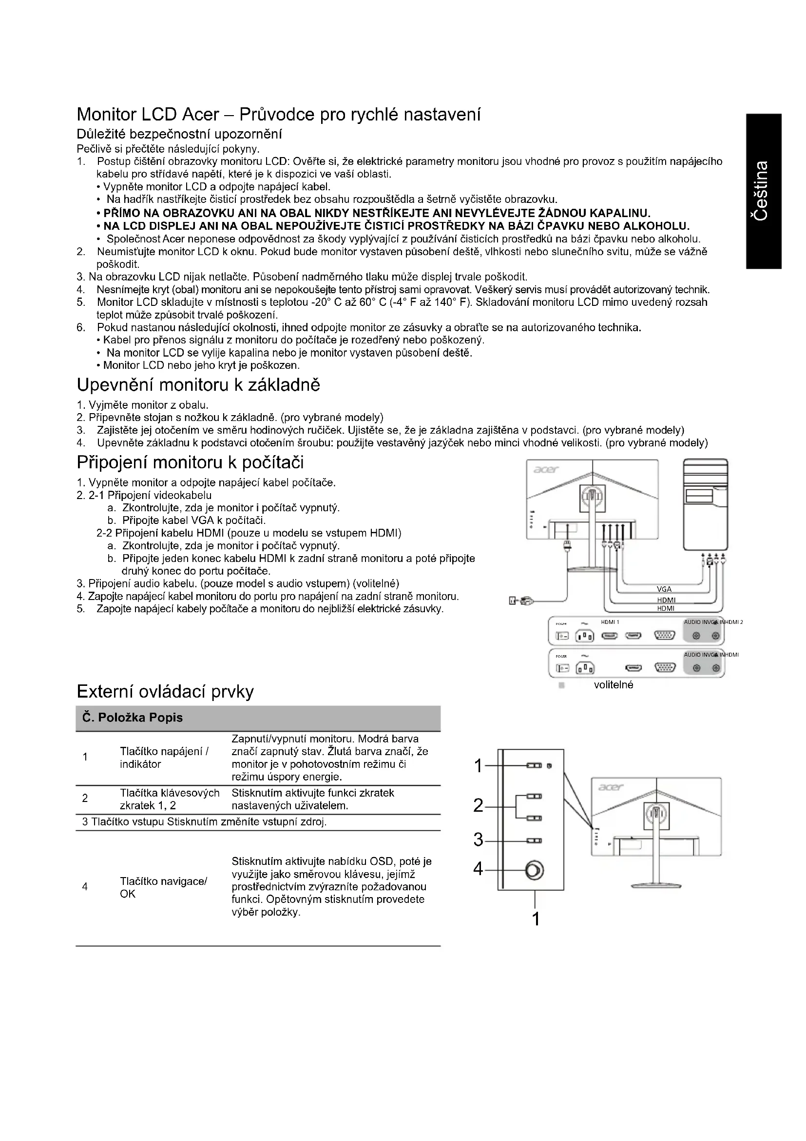 仕様は モ デ ルや地域に よ り 異な り ま す。Čeština Monitor LCD Acer – Průvodce pro rychlé nastavení Důležité bezpečnostní upozornění Pečlivě si přečtěte následující pokyny. 1. Postup čištění obrazovky monitoru LCD: Ověřte si, že elektrické parametry monitoru jsou vhodné pro provoz s použitím napájecího kabelu pro střídavé napětí, které je k dispozici ve vaší oblasti.• Vypněte monitor LCD a odpojte napájecí kabel.